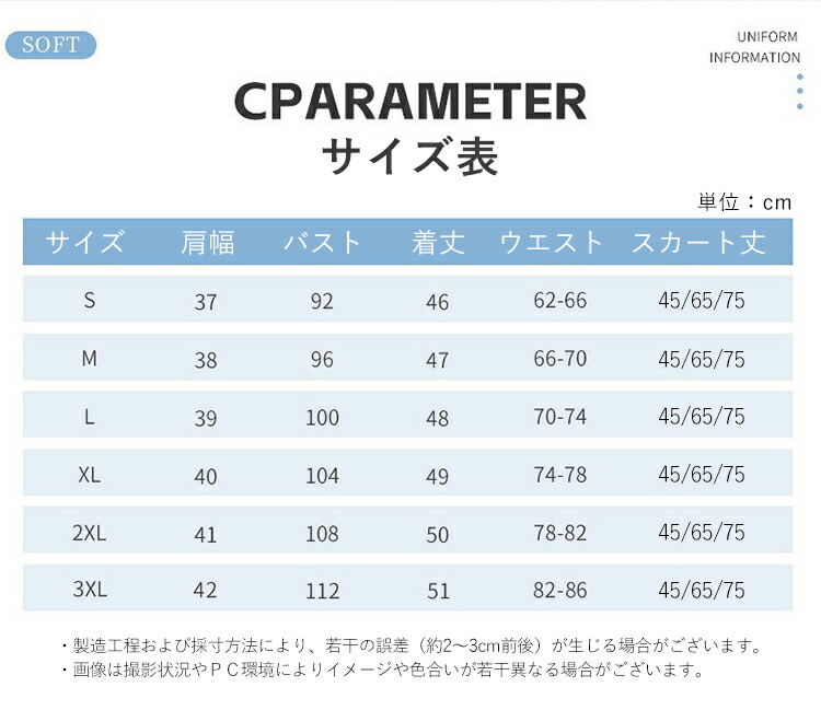 スカート丈:45cm(ミニ)、65cm(ミモレ丈)、75cm(ロング)の3種類から選択可能。