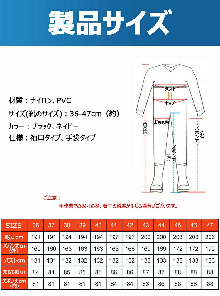 釣り ウェーダー 全身防水 長袖 完全 スポーツ アウトドア 豊富な品揃え ブラック【袖口タイプ】 ブラック【手袋タイプ】 ネイビー【袖口タイプ】 ネイビー【手袋タイプ】 36(靴サイズ23cm約) 37(靴サイズ23.5cm約) 38(靴サイズ24cm約) 39(靴サイズ24.5cm約) 40(靴サイズ25cm約) 41(靴サイズ25.5cm約) 42(靴サイズ26cm約) 43(靴サイズ26.5cm約) 44(靴サイズ27cm約) 45(靴サイズ27.5cm約) 46(靴サイズ28cm約) 47(靴サイズ28.5cm約)