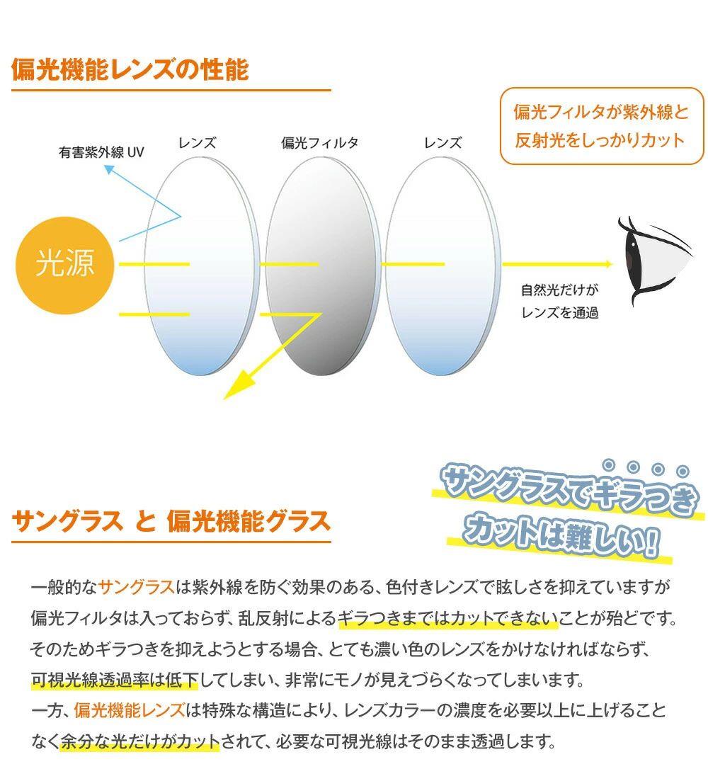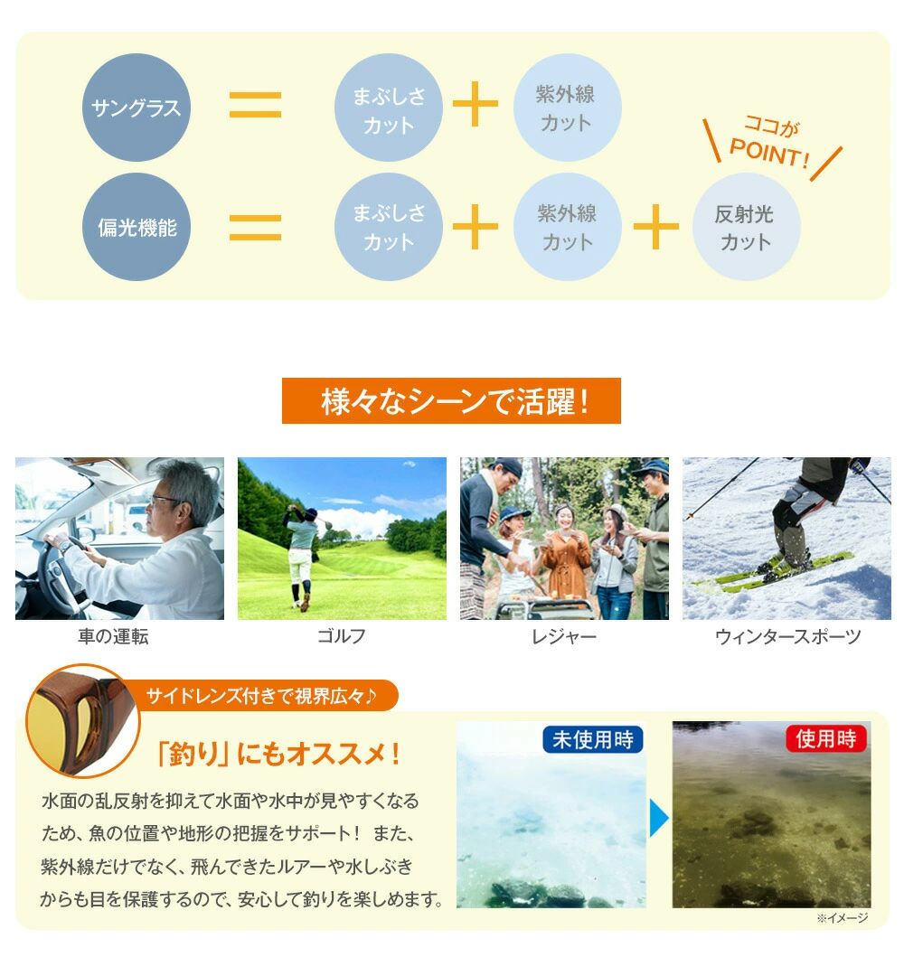 【偏光機能】強い光やギラつき(反射光)をカットし、クリアな視界で目の疲れを軽減。