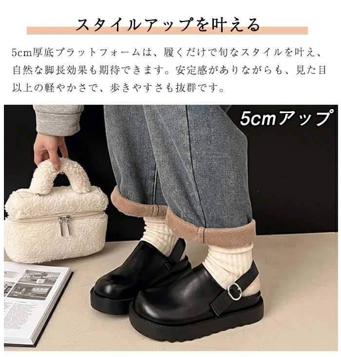このサボサンダルは、厚底デザインで5cmの身長アップを実現し、スタイルを引き立てます。