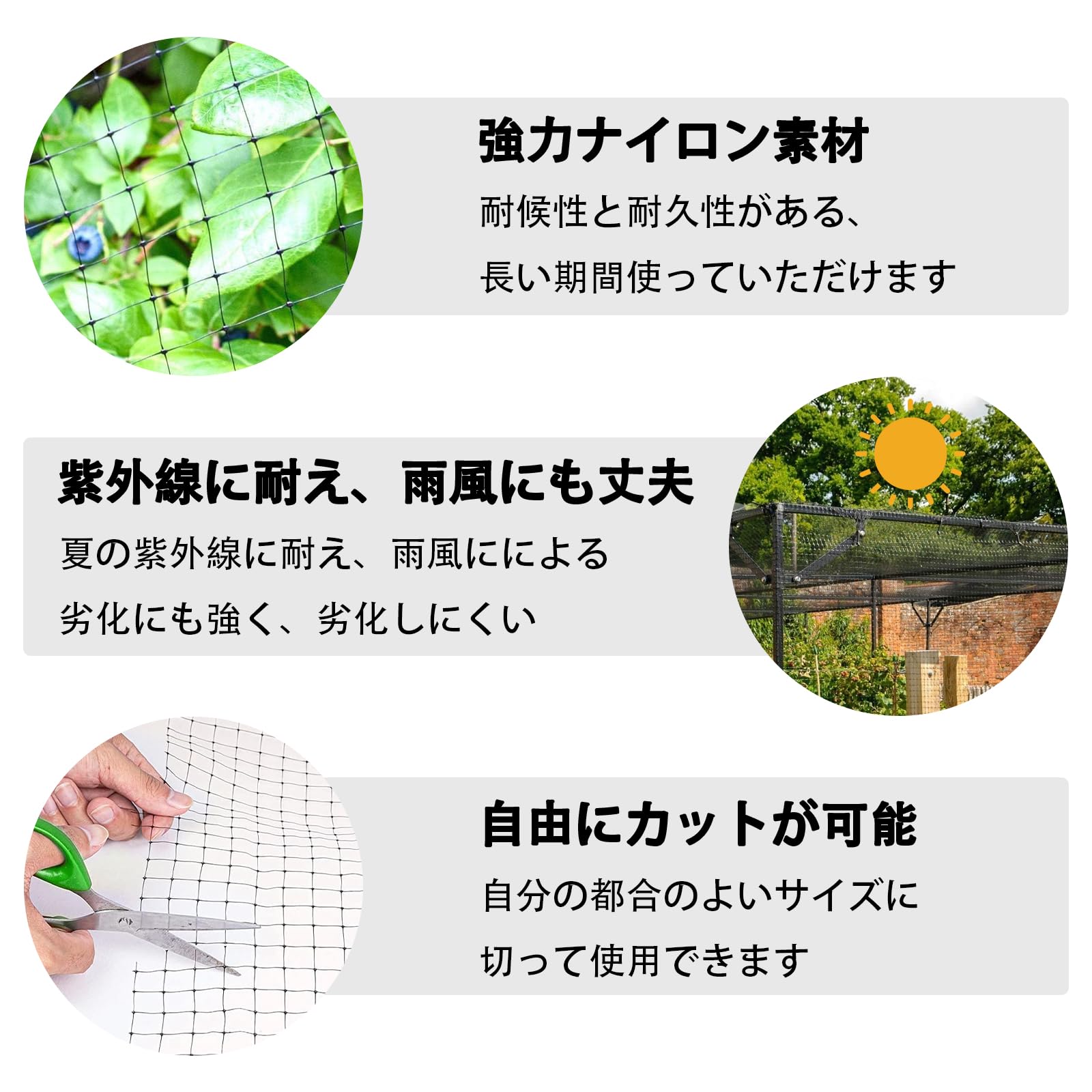 強力ナイロン素材】鳥よけネット全体は高強度ナイロン素材で作られております。通常の素材より、優れた耐破断性を持ちます。とても強度があり、強風などに強い。ナイロンで耐候性は良い、夏の紫外線に耐え、長時間に使用しても劣化しにくい。ある程度の硬さと重さがあるので、絡んでしまう恐れもありません、鳥被害も最小化にします。