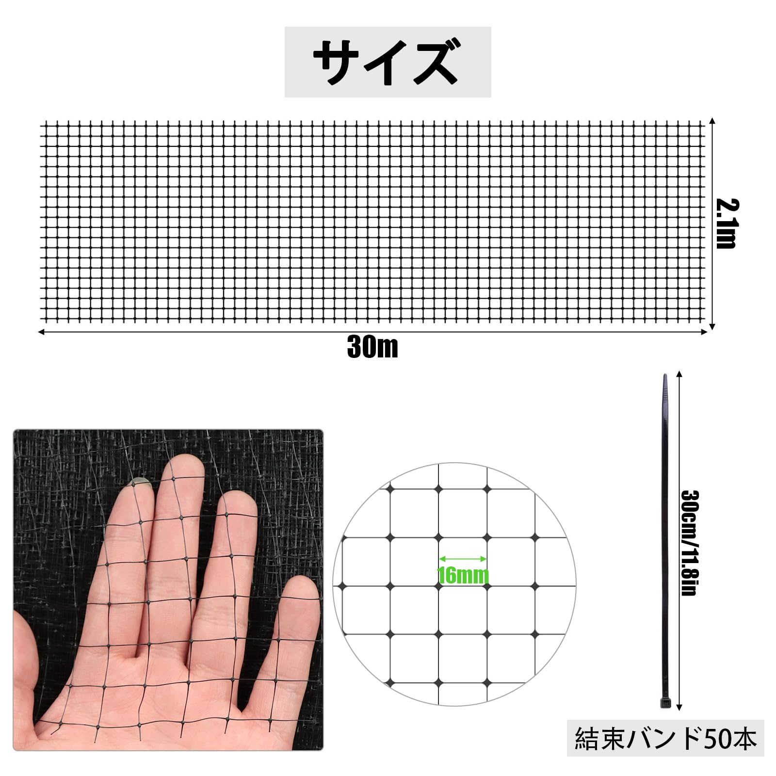 製品仕様】材質:ナイロン カラー:黒 幅:2.1m 全長:30m 目合い:16mm パッケージ内容:ネット(2.2*30m)*1巻、ケーブルタイ*50個。