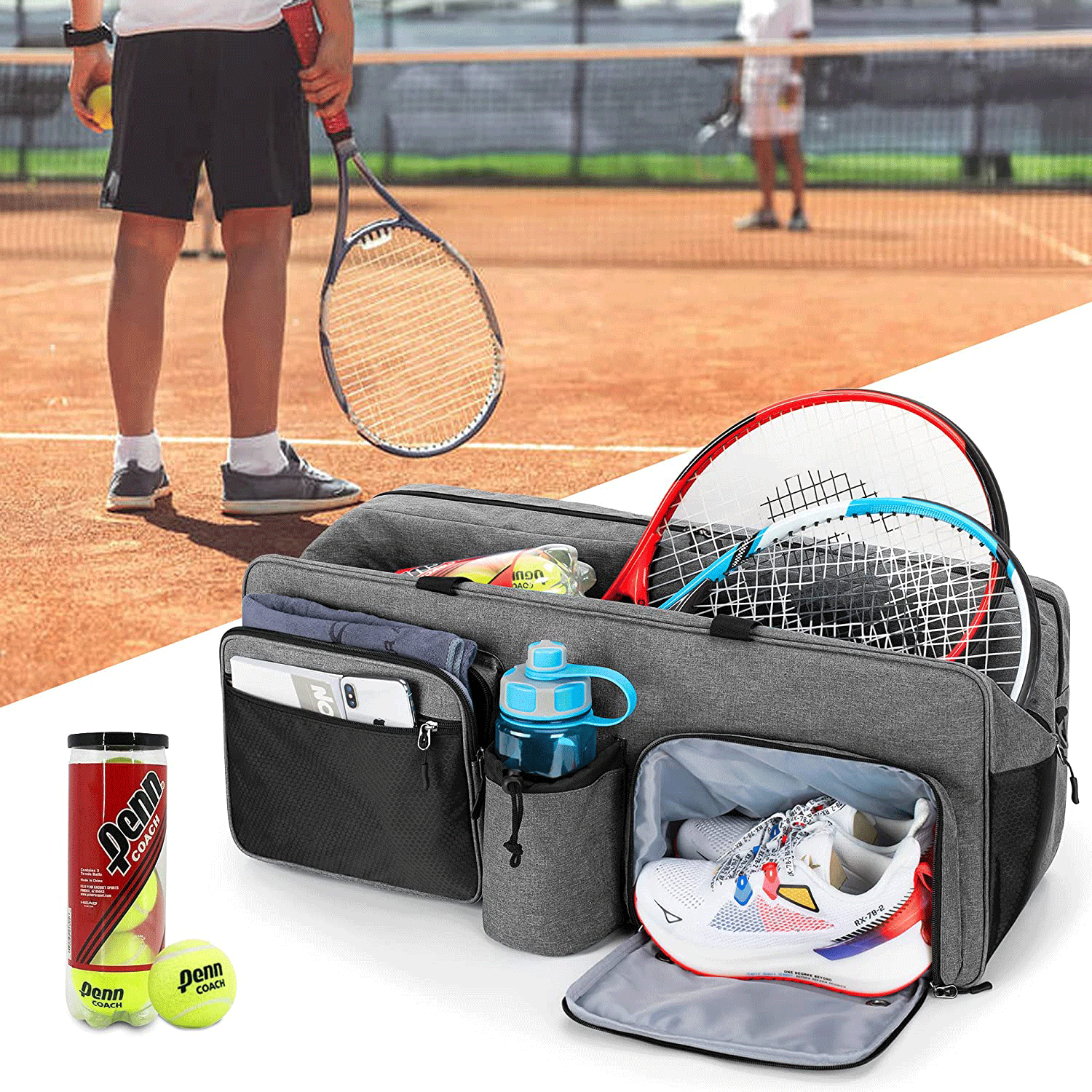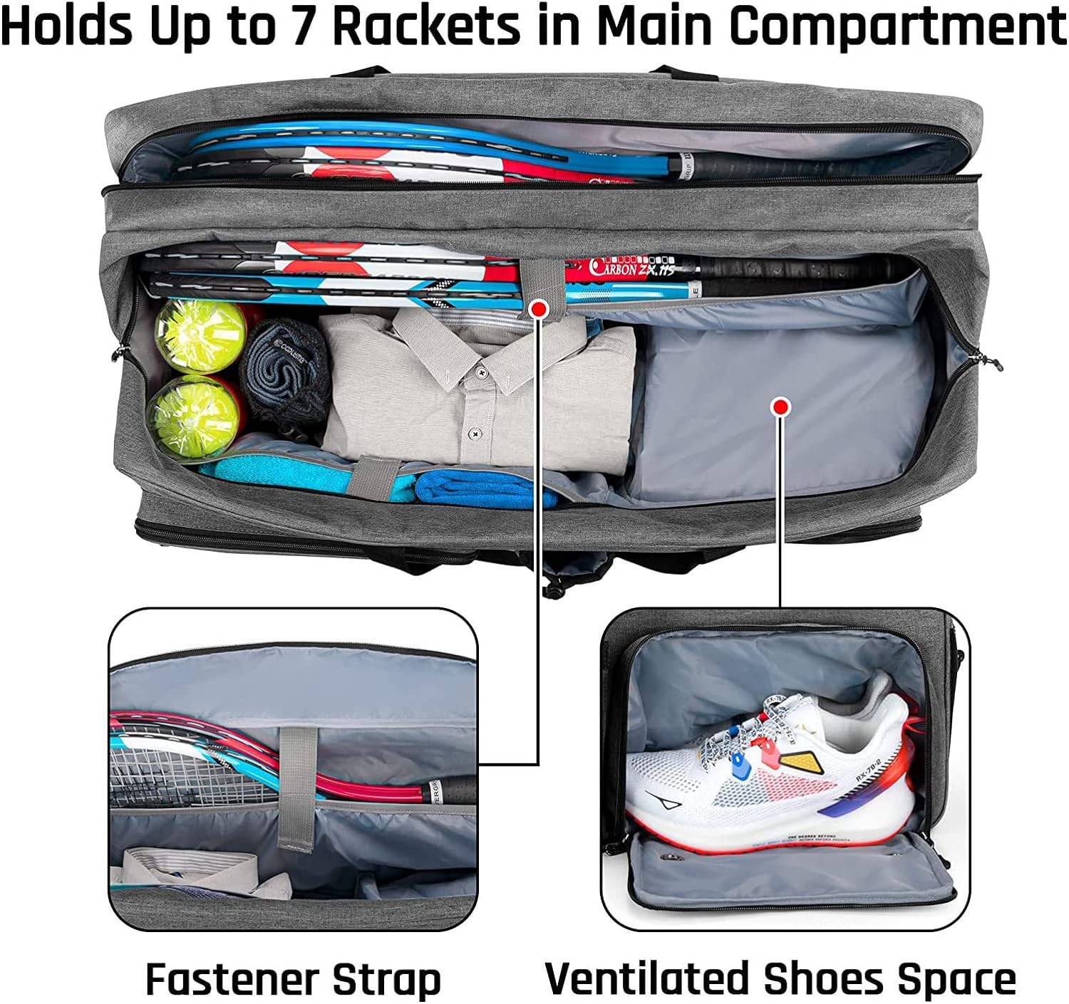 【大容量】トレーナーやテニスボールなどのスポーツ用品をたくさん収納できます。当社のテニス バッグは、メイン コンパートメントに最大 7 個のラケットを収納できます。フロントのジッパー付きポケットはタオルに最適で、伸縮性のあるポケットは水筒に使用されます。