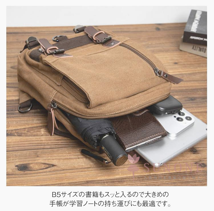 男女問わない高いデザイン性と、機能性を備えたキャンバスバッグ。多機能かつ大容量の便利な2WAYワンショルダー&リュックタイプです。サイド部にはスマホやデジカメがすっぽり収まるポケット付きです。しっかちとした持ち手付きで便利。B5サイズの書籍もスッと入るので大きめの手帳が学習ノートの持ち運びにも最適です。通勤・通学・お出掛け・旅行・アウトドアなど幅広いシーンで大活躍します。
