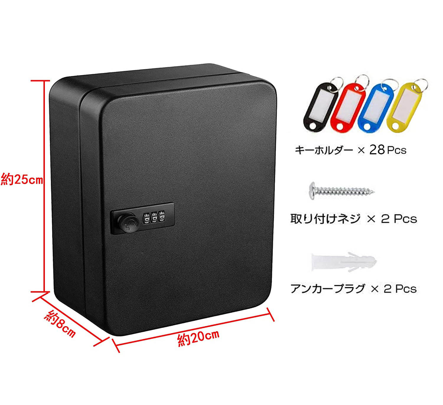 【ダイヤル式キーボックス】材質 スチール サイズ:25D x 20W x 8H cm 鍵収納数:28キー 重量:1.1kg、ゴム栓×2、ネジ×2、キーホルダー×28;職場や家庭で、鍵の保管・受け渡しをする際に役立つ、暗証番号で解錠するダイヤル式キーボックスです。