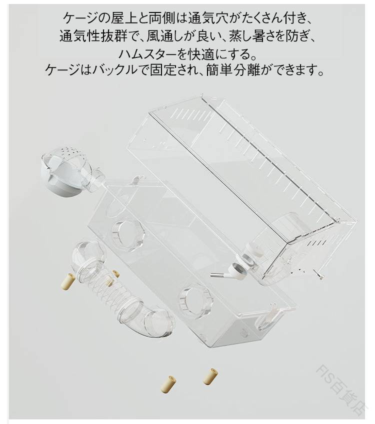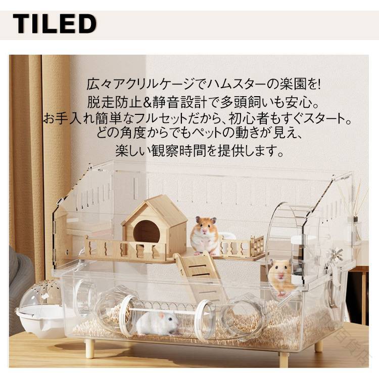 【ハムスター用ケージ 2階建て 透明 組立簡単】広々アクリルケージでハムスターの楽園を!脱走防止&静音設計で多頭飼いも安心。お手入れ簡単なフルセットだから、初心者もすぐスタート。ケージ本体、給水ボトル、餌入れ、ハウス、お風呂などで構成されています。高級ヴィラのような二階建てのデザインで、ペットが快適に過ごせるスペースを確保しています。静かで回りができるまわし車付いて、ハムスターの運動不足を解消することができます。どの角度からでもペットの動きが見え、楽しい観察時間を提供します。ペットの遊びや休息を見守ることができます。丸まって眠っているハムちゃんがうっすら見えて、とてもかわいいです。ケージの屋上と両側は通気穴がたくさん付き、通気性抜群で、風通しが良い、蒸し暑さを防ぎ、ハムスターを快適にする。開放感が あり通気性に優れているため、湿気、ニオイや熱がこもりません。ケージはバックルで固定され、簡単分離ができます。引っ越しや収納運送にも便利です。一回で木屑やゴミを出すことできます。衛生的な住まいを提供し、ペットの健康をサポートします。