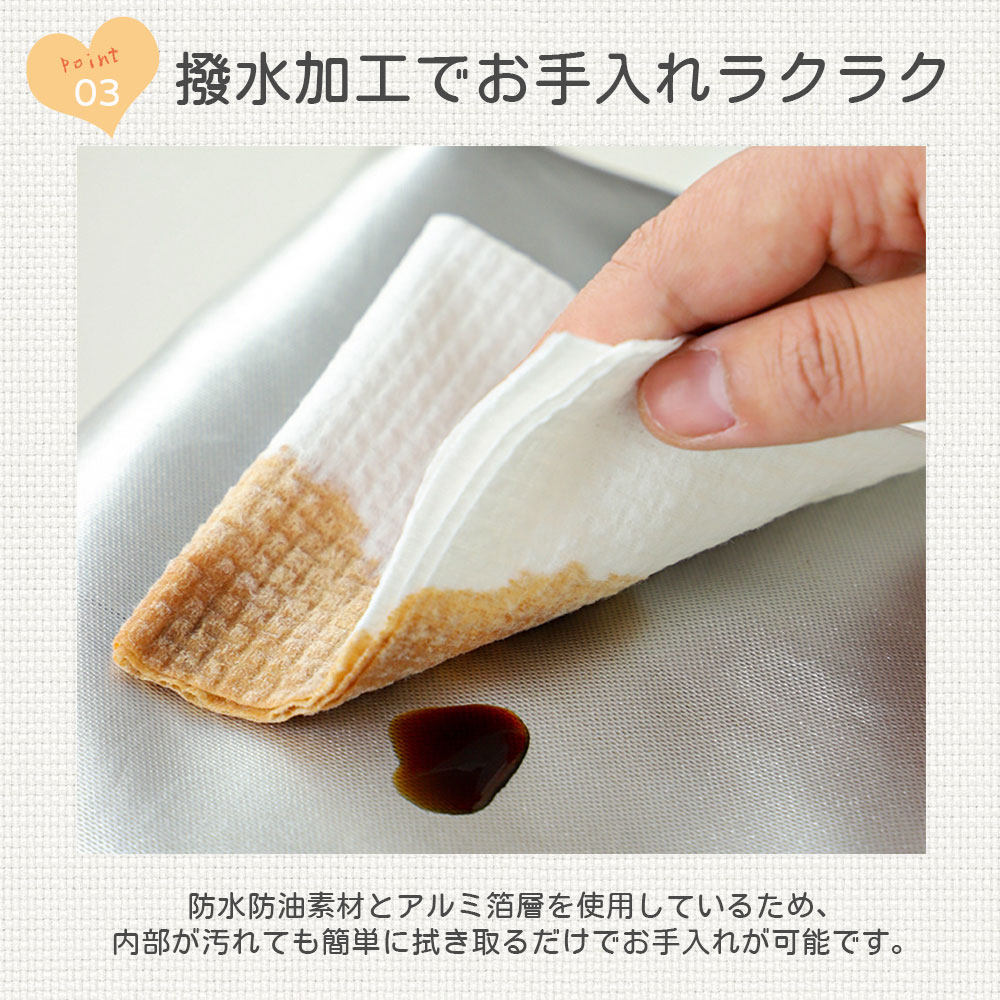 防水防油素材とアルミ箔層を使用しているため、内部が汚れても簡単に拭き取るだけでお手入れが可能です。