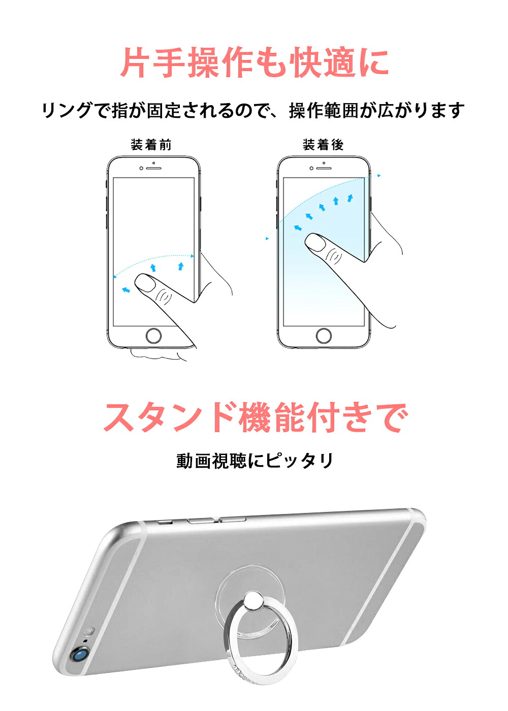 片手操作も快適に、リングで指が固定されるので、操作範囲が広がります。