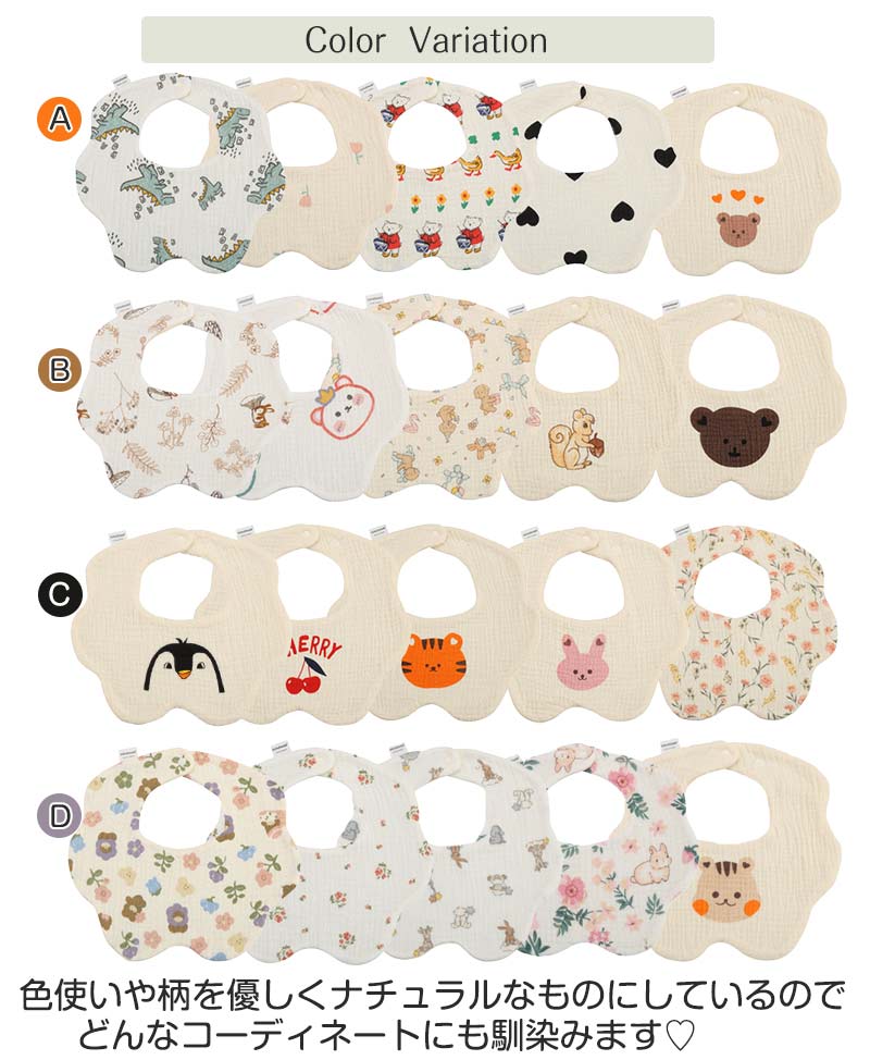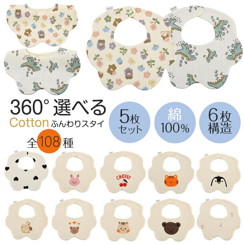 スタイ 5枚セット おしゃれ 男の子 女の子 よだれかけ よだれ掛け 108種類 ガーゼ 大きめ 吸水性 360 ベビー 赤ちゃん ビブ 前かけ 綿100% コットン 男児 女児 ボーイズ 6重ガーゼ