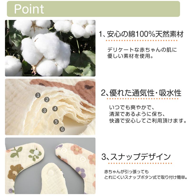 スタイの素材はデリケートな赤ちゃんの肌にも優しいコットン100%(綿100%)生地。