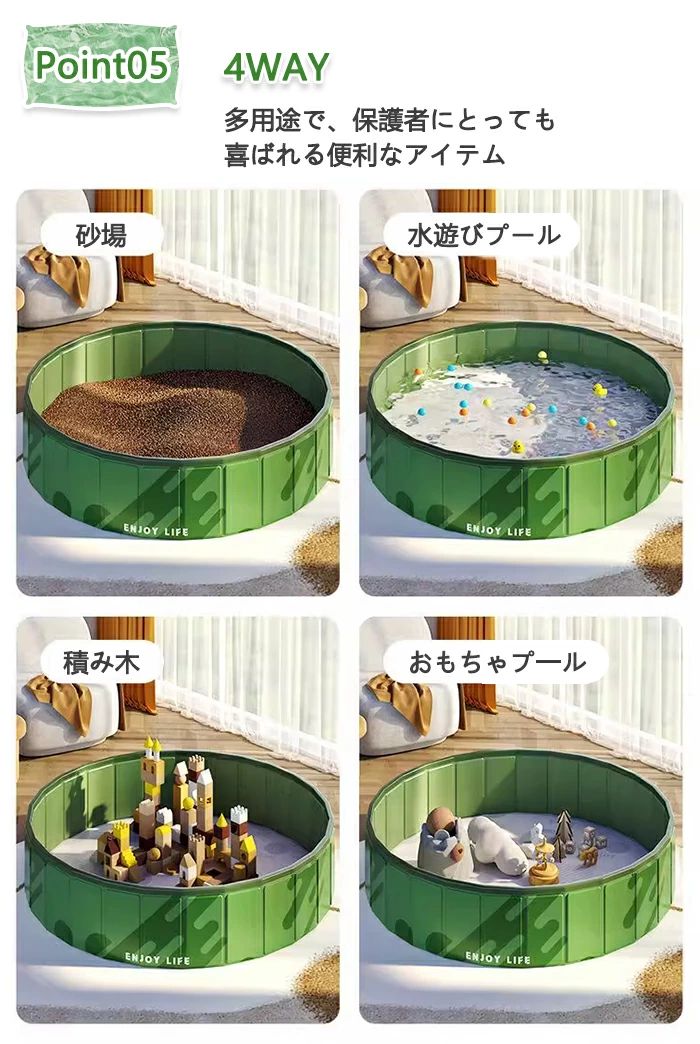 ペットが水浴びを楽しむだけでなく、子供用プールやボールプール、釣り用プール、おもちゃのプールとしても活躍します。裏庭や芝生、ビーチ、さらには屋内でも使えるので、犬や子供たちが楽しい夏を過ごせるアイテムです。