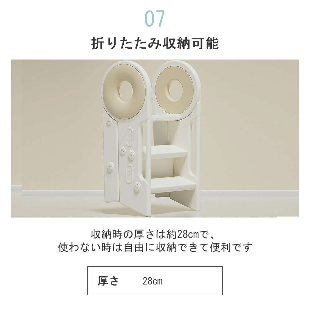【省スペース収納】キッズ踏み台は、簡単に折りたたむことができ、使わない時はコンパクトでスリムな形状になり、狭い場所でもすっきりと収納することができます。