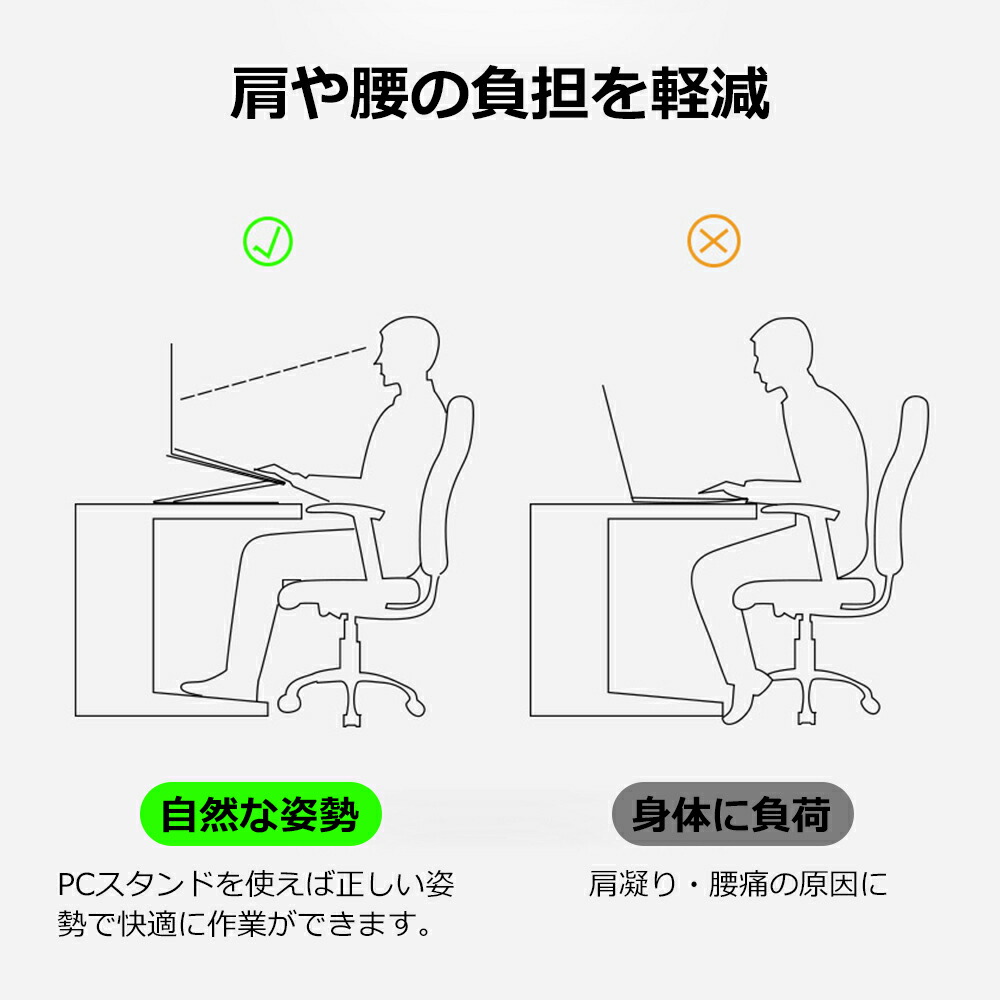 ノートパソコンスタンド本体は厚さ2.5mmのアルミ合金素材で加工されるため、20kg以内の重量まで耐えられます。なお、低重心設計に加え、Z型デザインにする事でスタンドの安定性を向上させているので、タイピング時の不快な揺れを最小限に抑えられています。弊社のスタンドは長さ27x22.5cmで、7~17.3インチまでのさまざまなノートPCやタブレットを幅広く対応可能です。また、台座の面積が大きく設計されているため、薄いパソコンシリーズでも開きやすいのも魅力です。