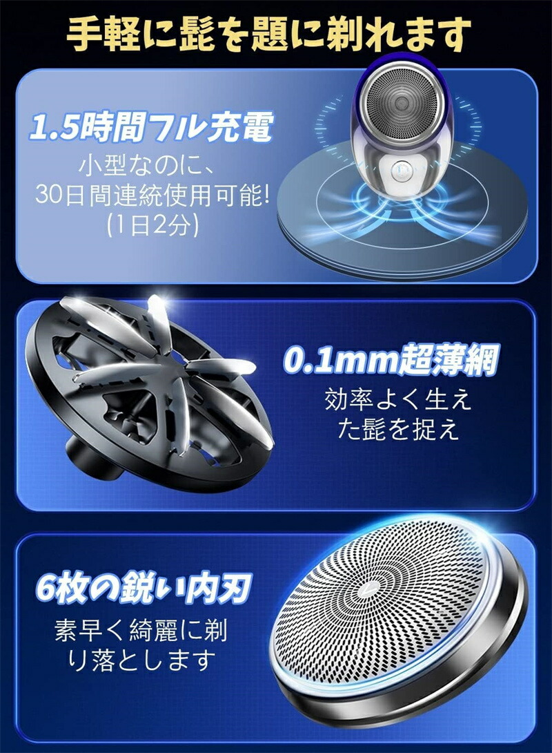 小型電動シェーバー ドイツ製 6枚内刃 ミニシェーバー IPX7防水 水洗い可 乾湿両用 お風呂剃 黒ずみを残さない 長さ8.5cm 超軽量 髭剃り 電動 メンズシェーバー 超小型&携帯便利