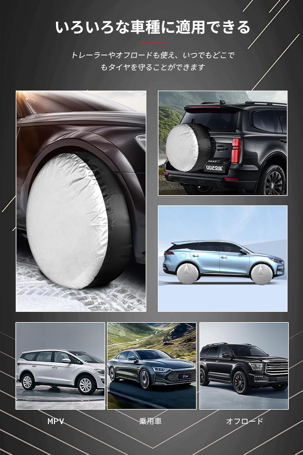 タイヤカバーに210Dポリエステル材質の牛津布を採用。 破損しにくく、丈夫で耐久性に優れているのが特徴です。 軽自動車、普通自動車、SUVなど様々なタイプのタイヤに適しています。