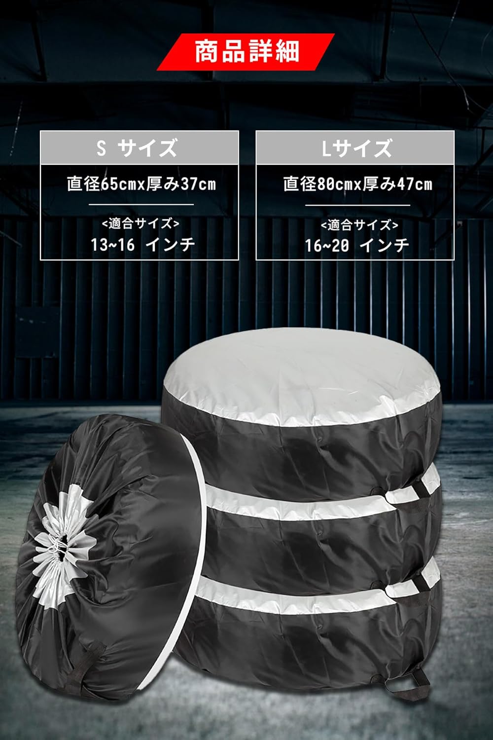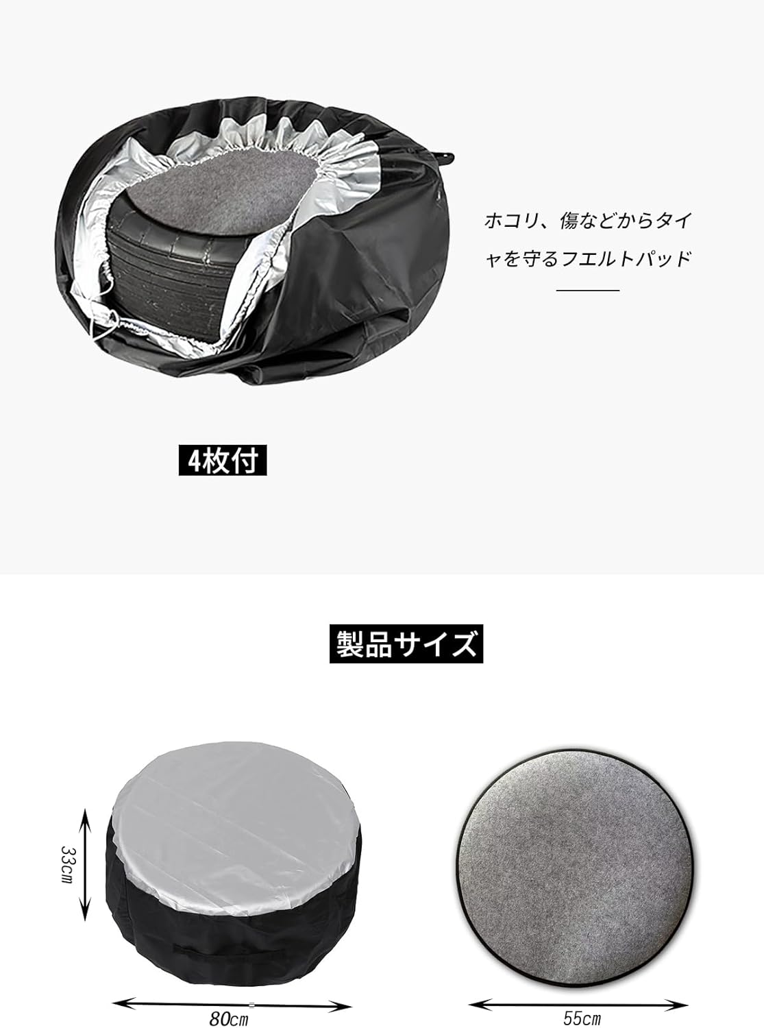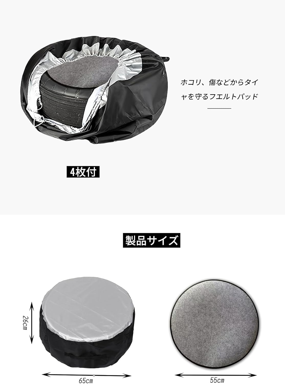 セット内容:タイヤカバー4個、フェルトパッド4個。 Sサイズ:直径65センチ×厚さ37センチ / 適合タイヤ:13~16インチ Lサイズ:直径80センチ×厚さ47センチ / 適合タイヤ:16~20インチ、商品の破損や部品の紛失に気づいた場合は、早急にご連絡ください。