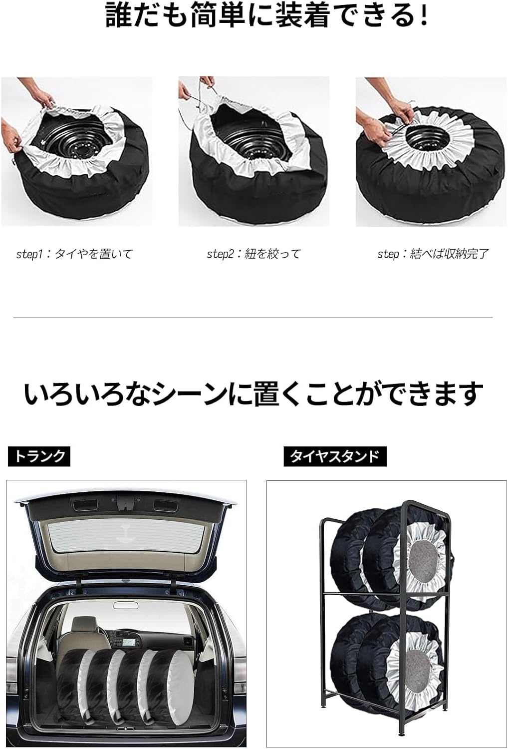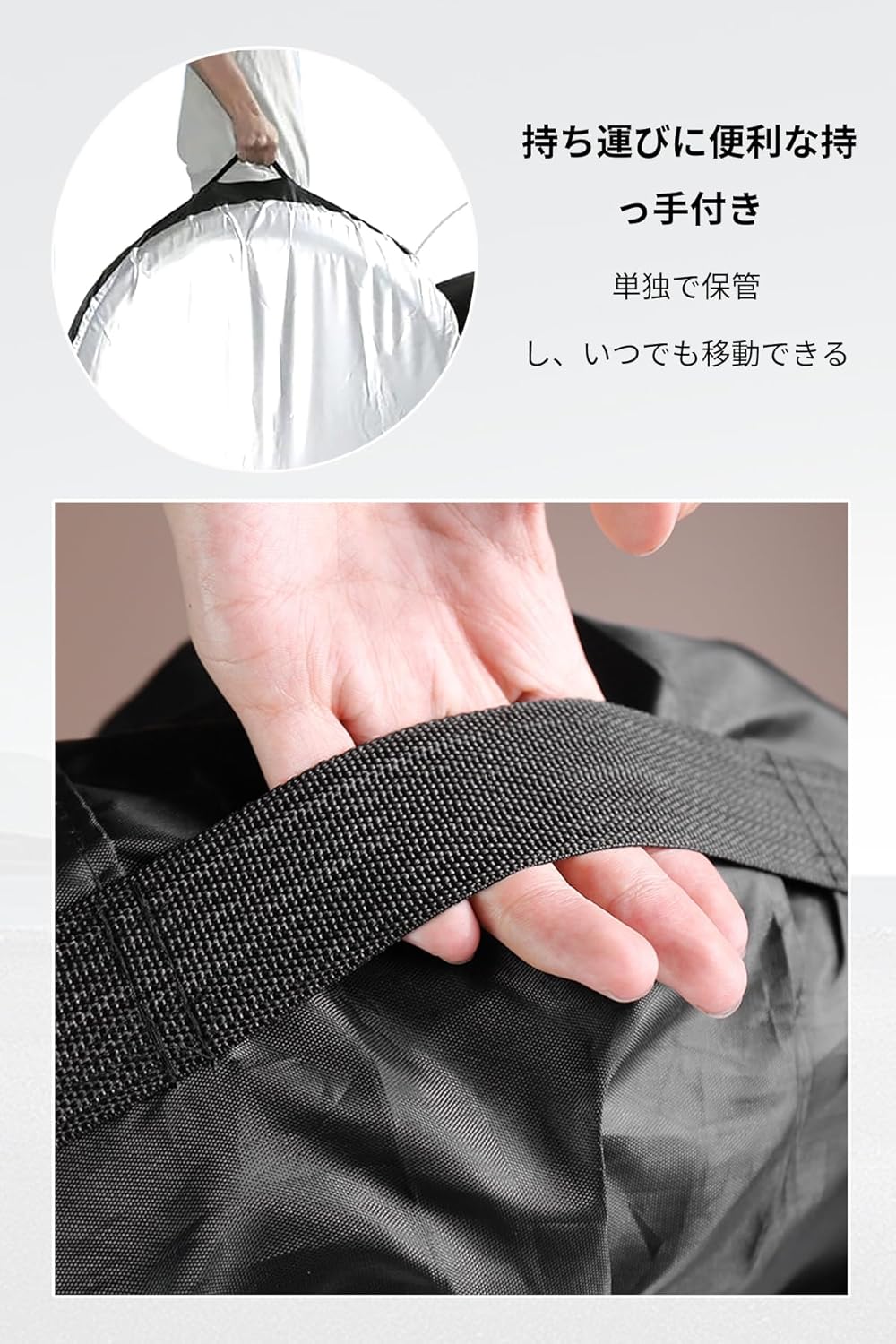 タイヤカバーを広げてタイヤにはめた後、ロープを縛る。 誰でも簡単にインストールできます。 持ち手がついているので、移動しやすく、携帯しやすい。