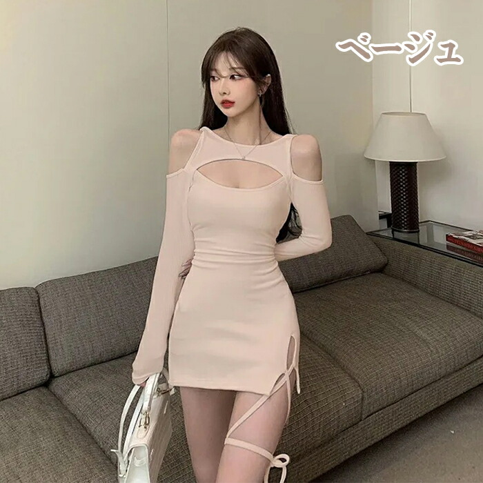 胸あき 肩出し オフショルダー タイト 胸元 セクシー ミニ ワンピース 脚長効果 胸開き 長袖 レディース ミニワンピ リボン タイトワンピース 秋冬 春先 ボディコン