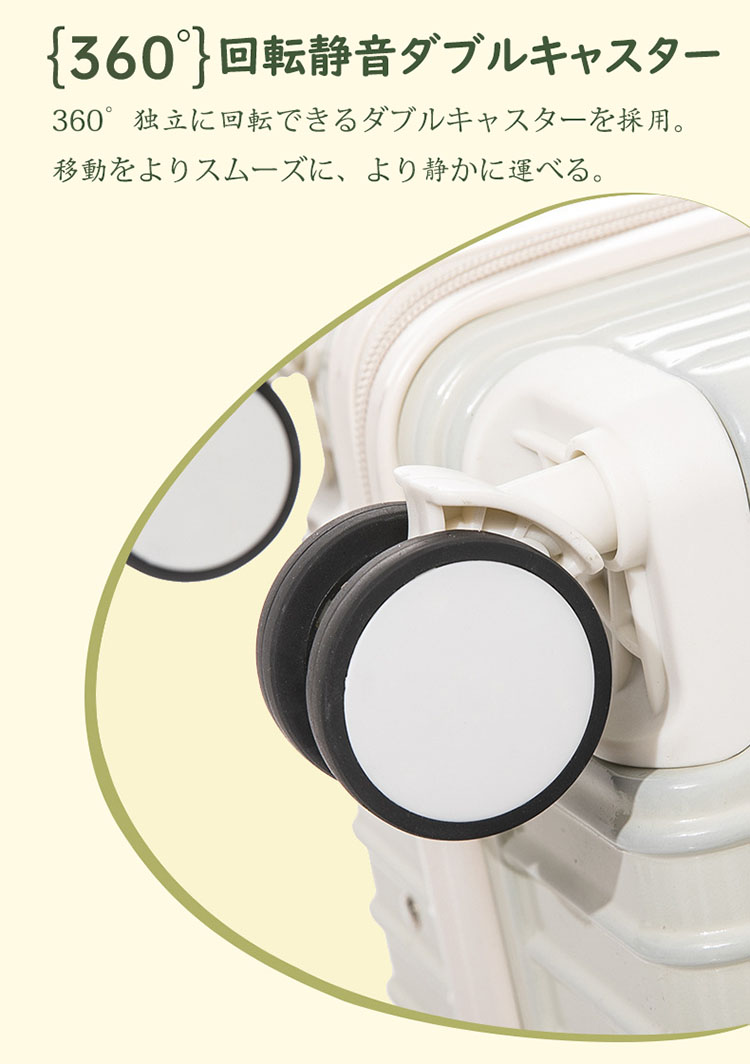 ※360°回転静音ダブルキャスター:360°独立に回転できるダブルキャスターを採用。移動をよりスムーズに、より静かに運べる。