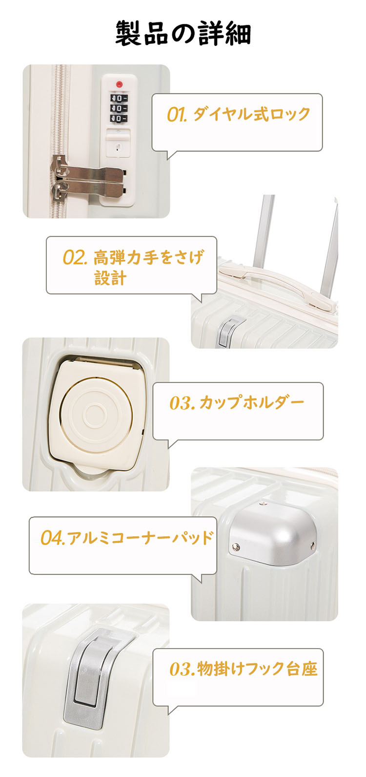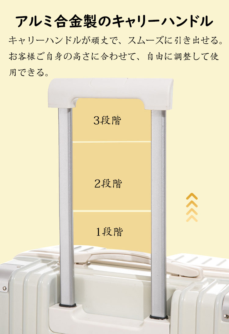 ※アルミ合金製のキャリーハンドル:キャリーハンドルが頑丈で、スムーズに引き出せる。お客様ご自身の高さに合わせて、自由に調整して使用できる。