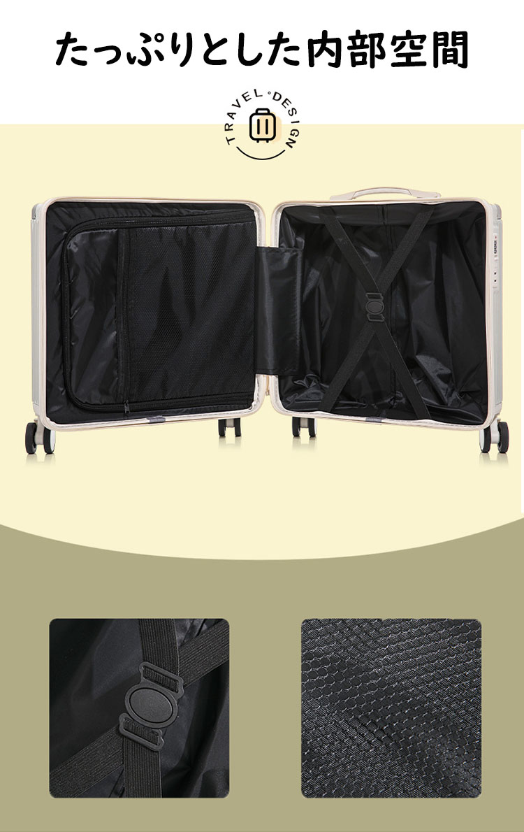 材質:ABS+PC素材(ボディー)+アルミ合金(キャリーバー)+エコポリエステル生地(内張り)