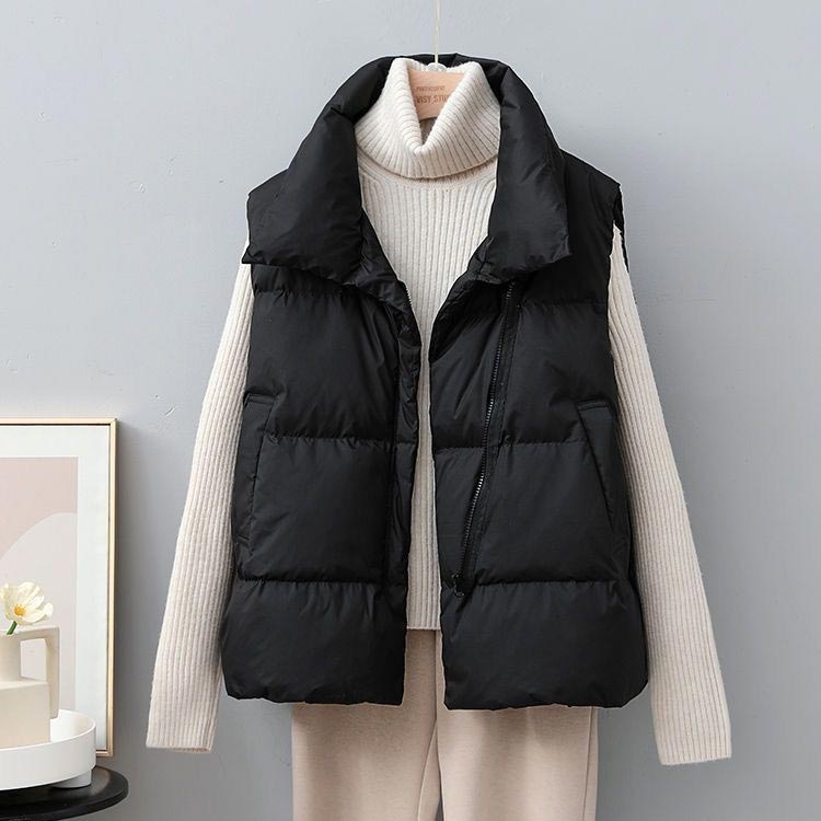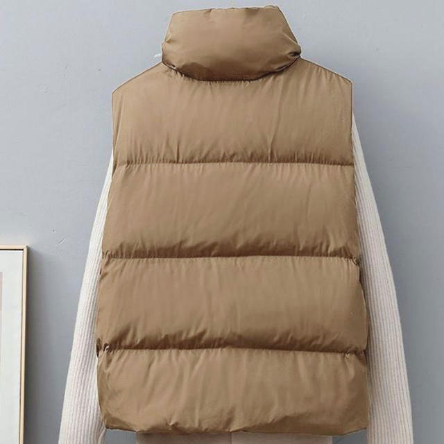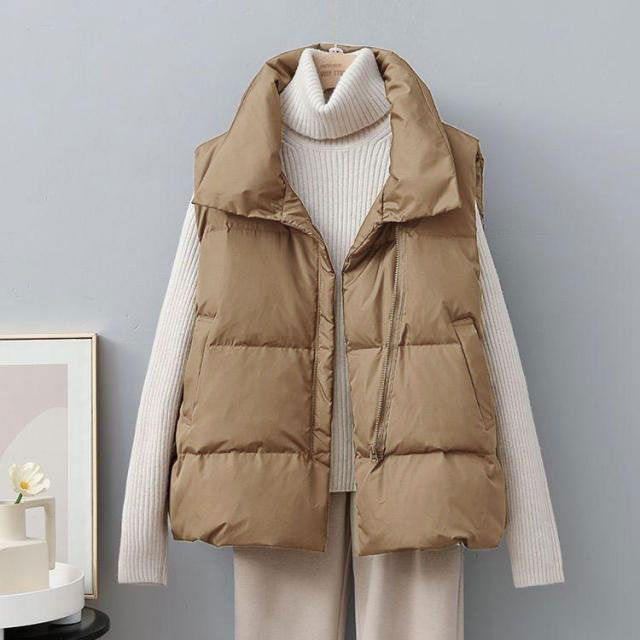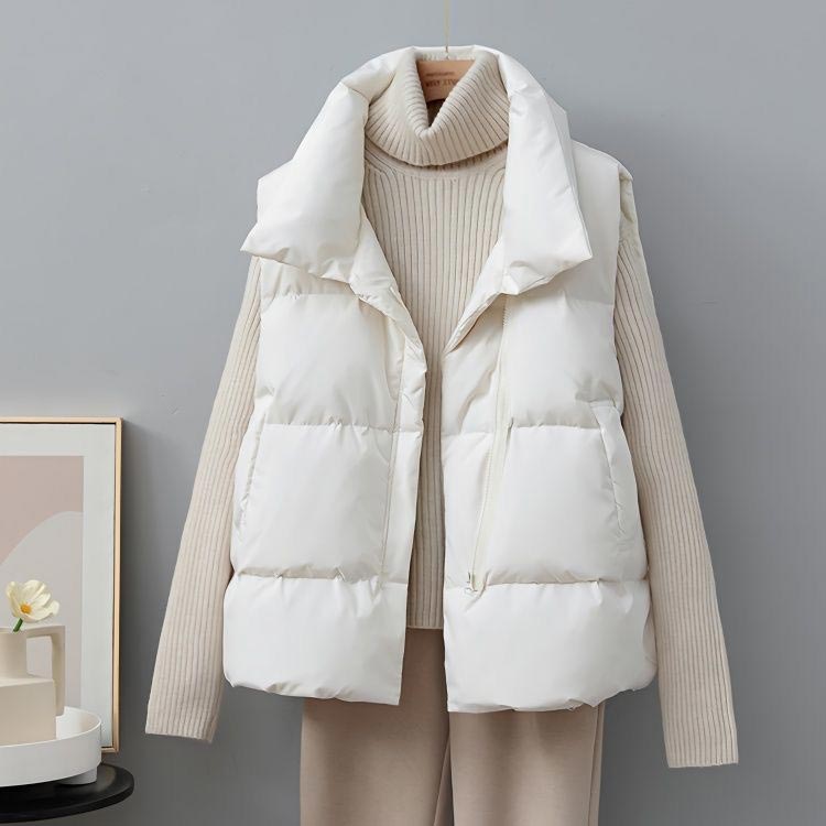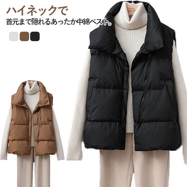 ハイネックで首元まで隠れるあったか中綿ベスト。