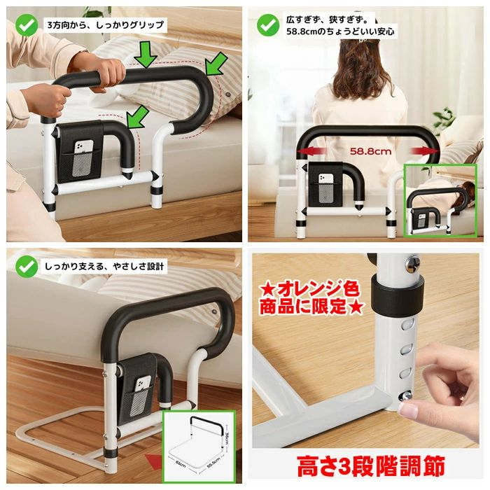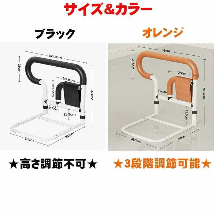ベッド 手すり 後付け 柵 起き上がり ブラック(高さ調節不可) オレンジ(高さ3段階調節)