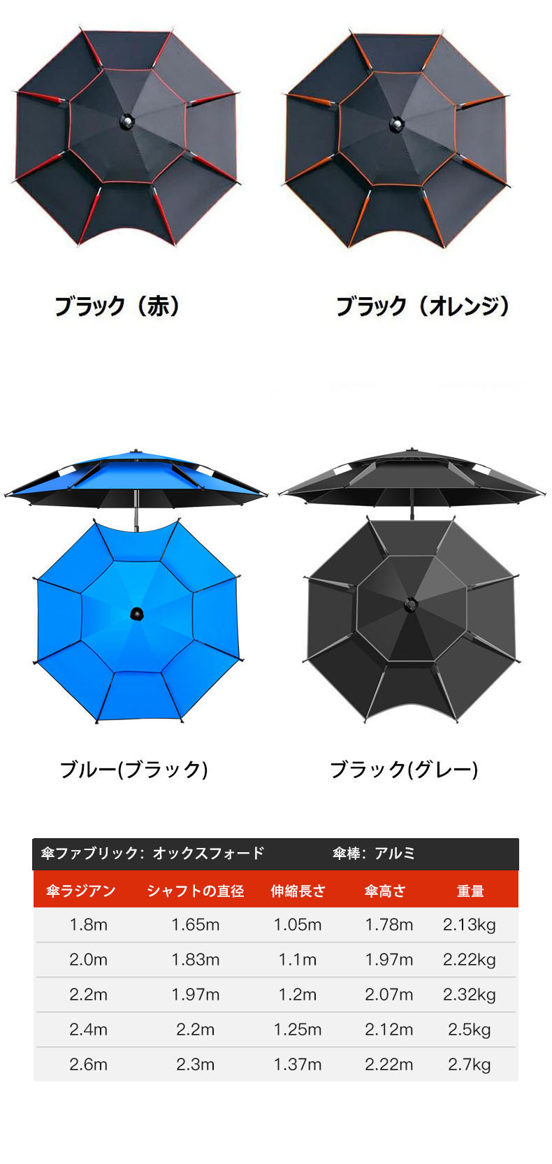 釣り用傘 フィッシングパラソル パラソ スポーツ アウトドア 通販 ブラック(赤) ブラック(オレンジ) ブルー(ブラック) ベージュ(ブラック) 空色(ブラック) 1.8m 2m 2.2m 2.4m 2.6m