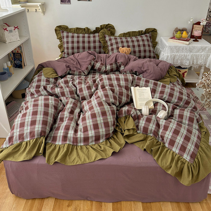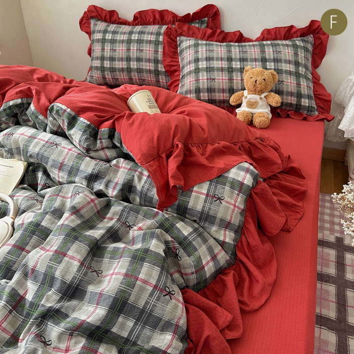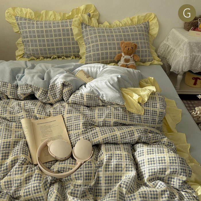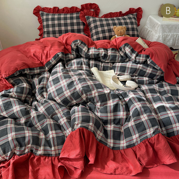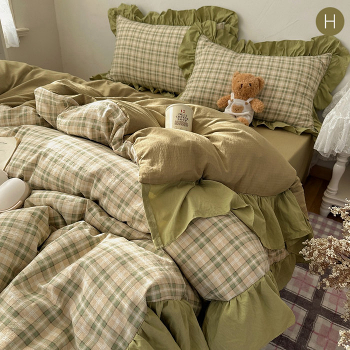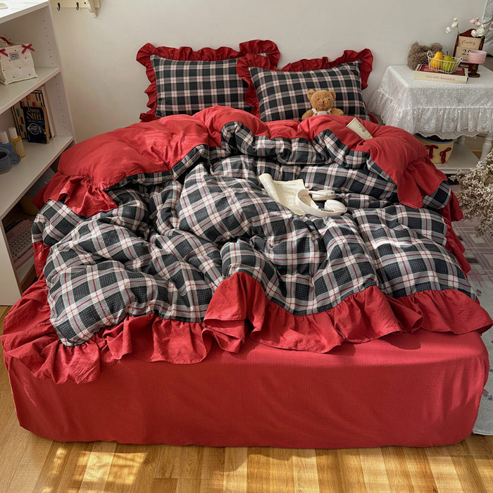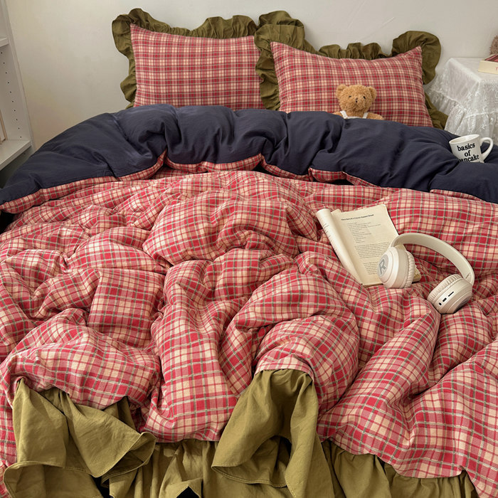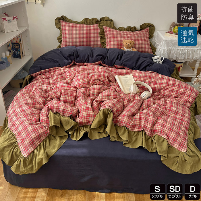 チェック柄 掛け布団カバー シングル ダブル セミダブル 対応 3点4点セット フリル付き 敷布団カバー 水洗い加工 超柔らかい 肌に優しい 防ダニ 通気性 冬用 寝具カバー ベッド用品 エレガント