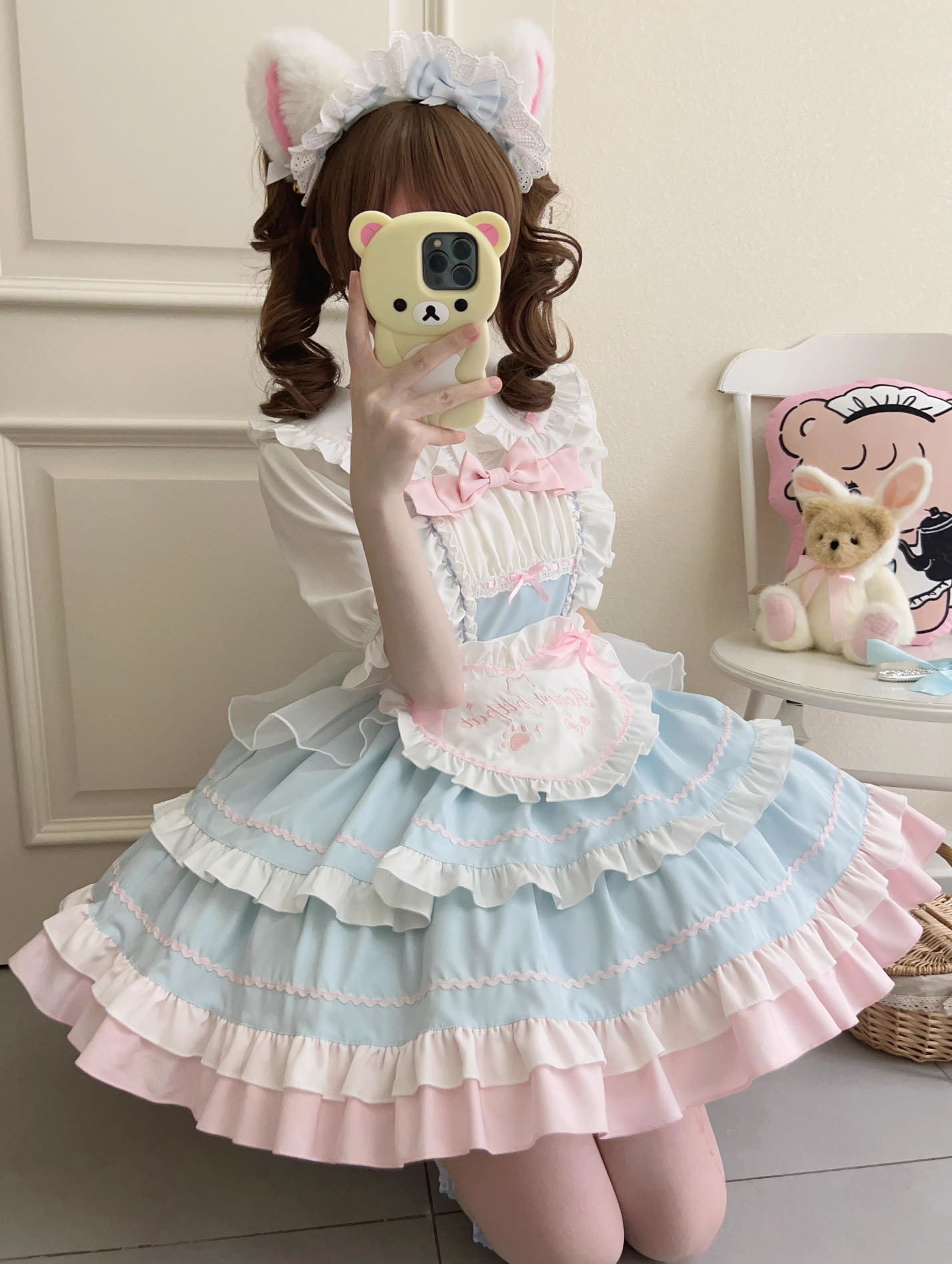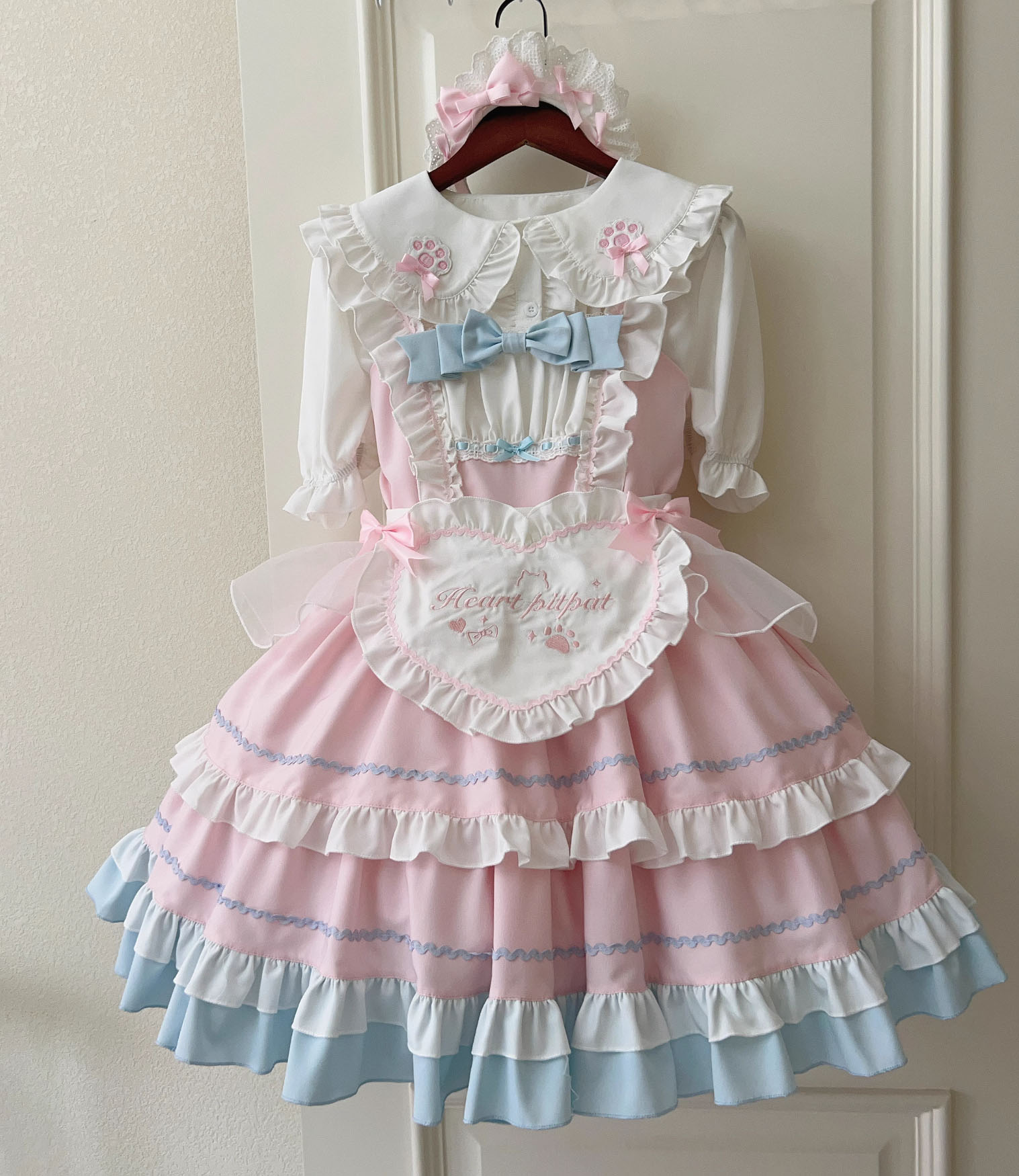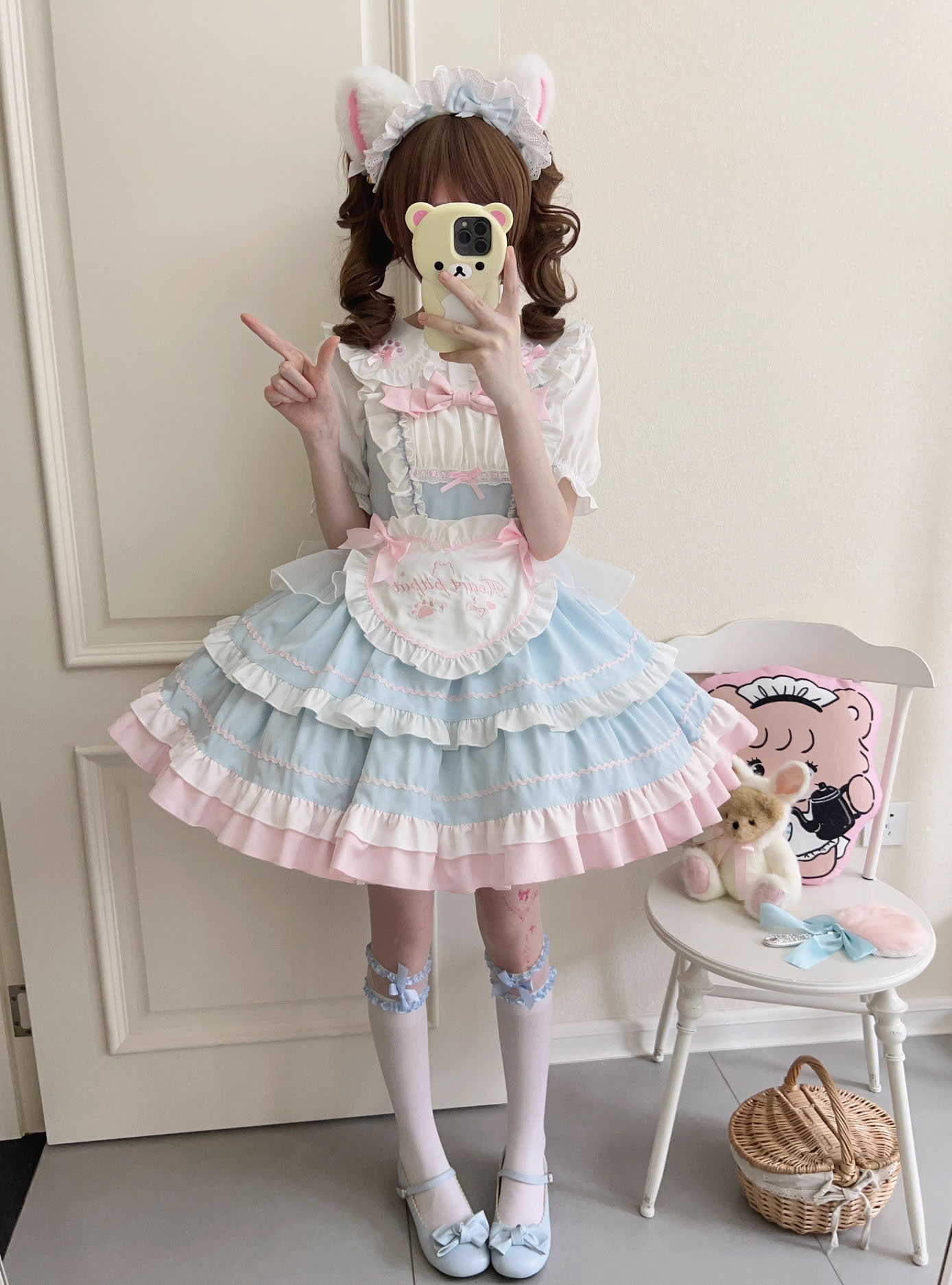 ロリータ ワンピース ジャンパースカート ゴスロリ ロリータ服 膝丈 ショート丈 フリル Aライン ロリータドレス チュール付 ハートのエプロン 蝶リボン 萌え萌え メイド服 半袖 可愛い
