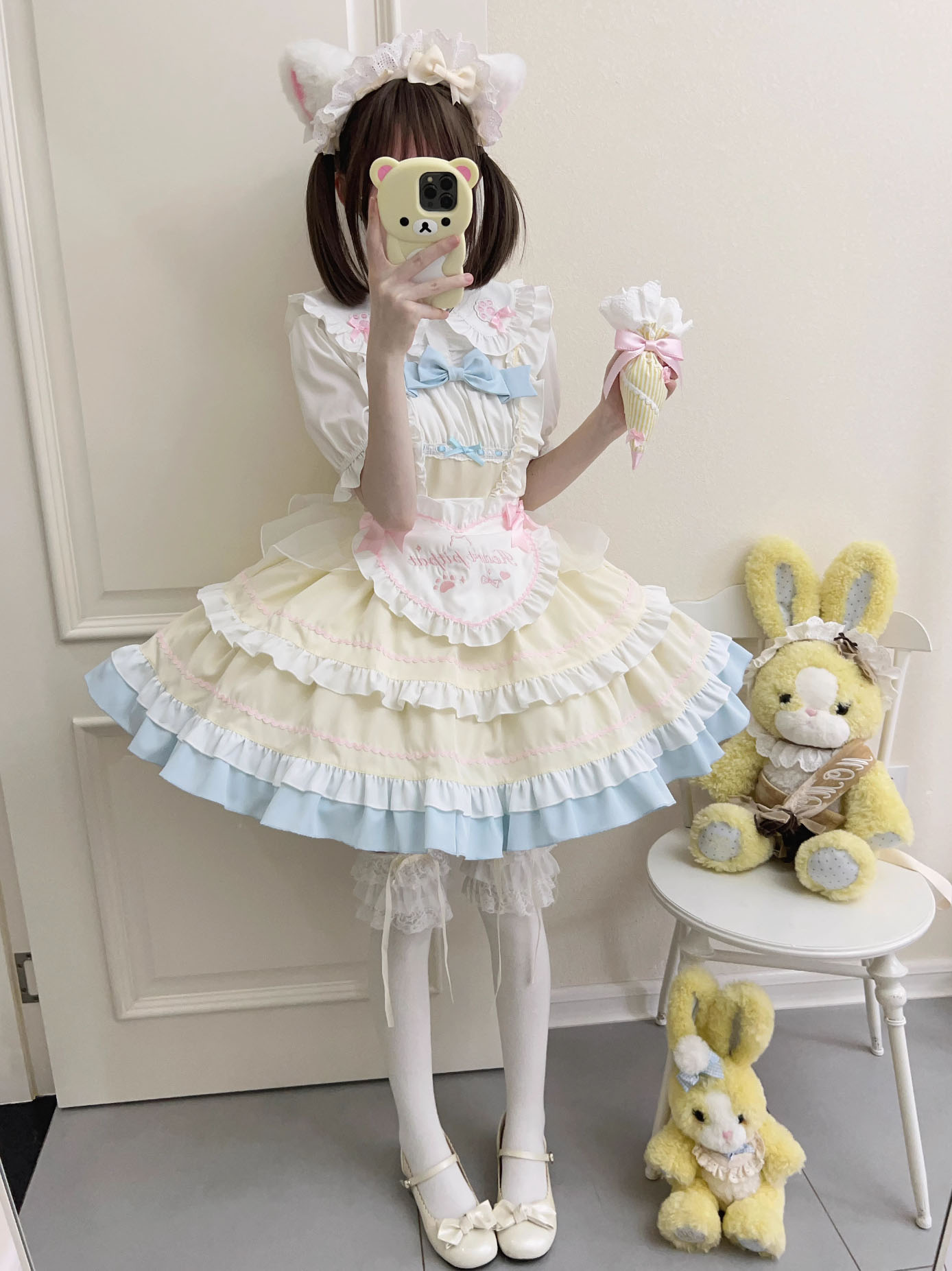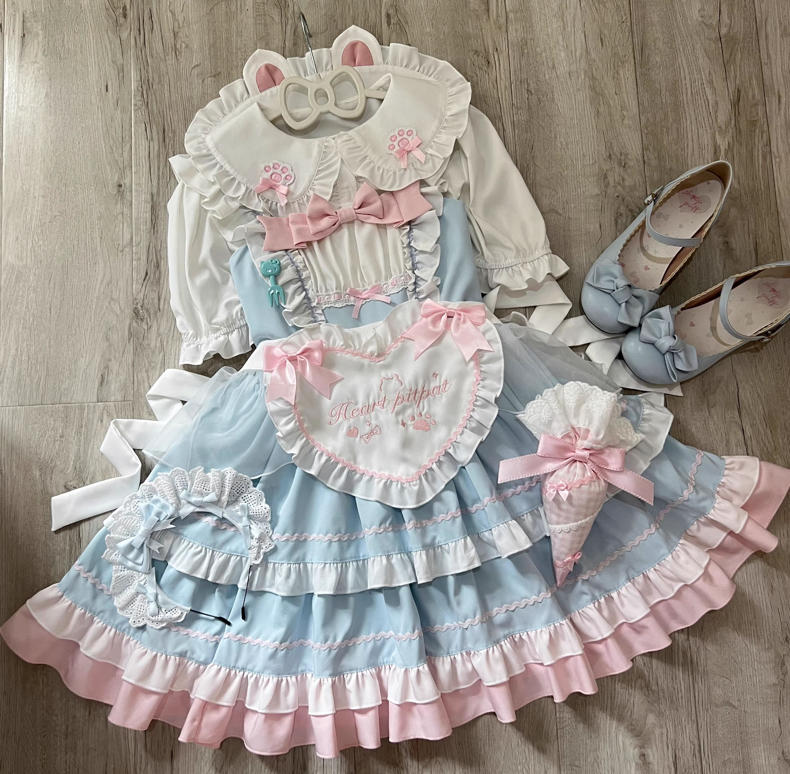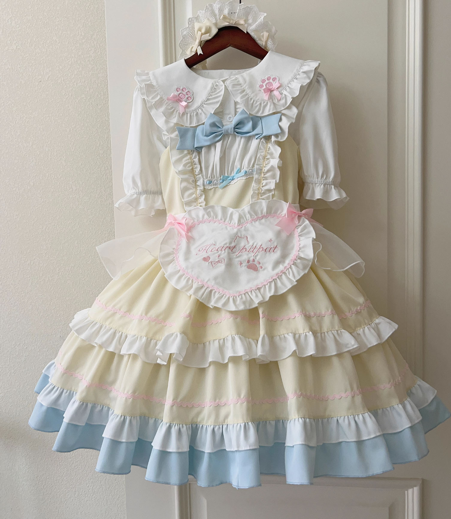 ロリータ ワンピース ジャンパースカート ゴスロリ ロリータ服 膝丈 ショート丈 フリル Aライン ロリータドレス チュール付 ハートのエプロン 蝶リボン 萌え萌え メイド服 半袖 可愛い