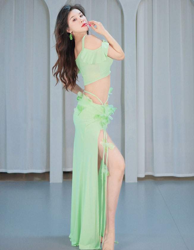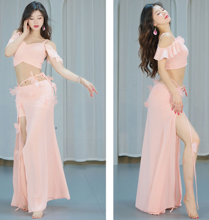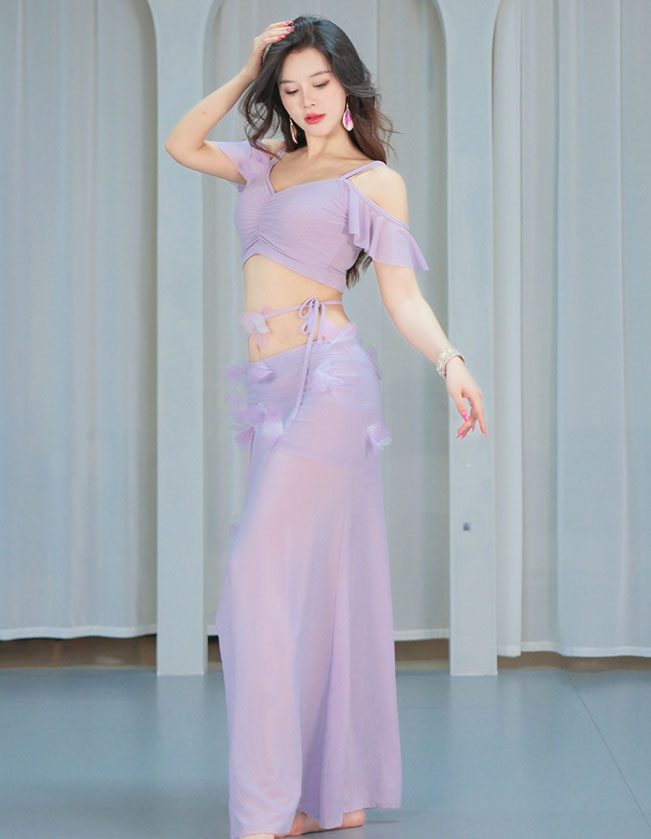 ベリーダンス衣装2点セットアップ レディース 大人 半袖 ストラップ 肩出し ショート丈トップス ロング丈 スリット スカート 花 フラワー付き セクシー 美シルエット ベリーダンス シースルー生地