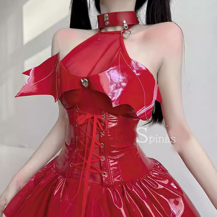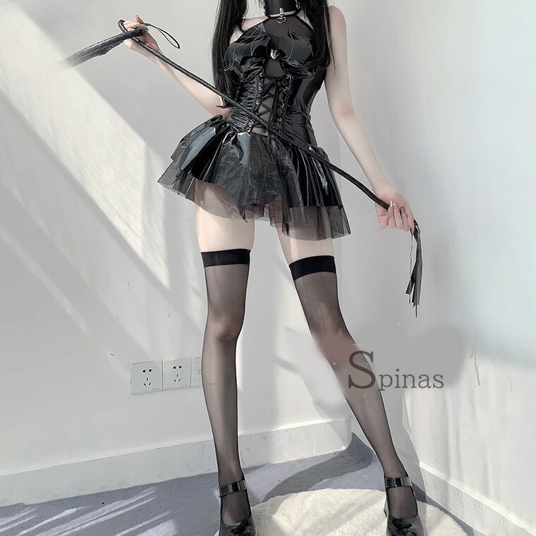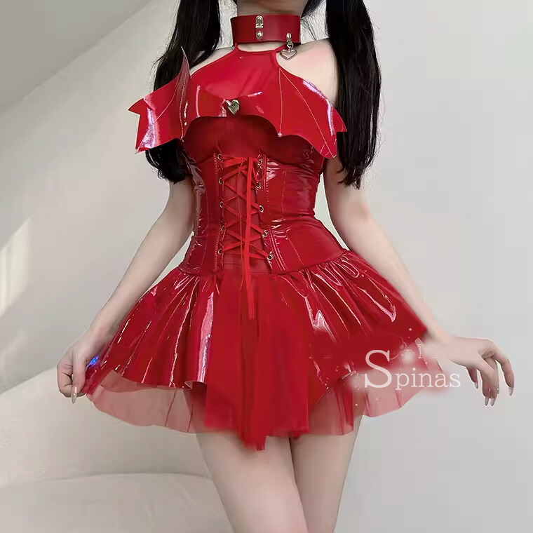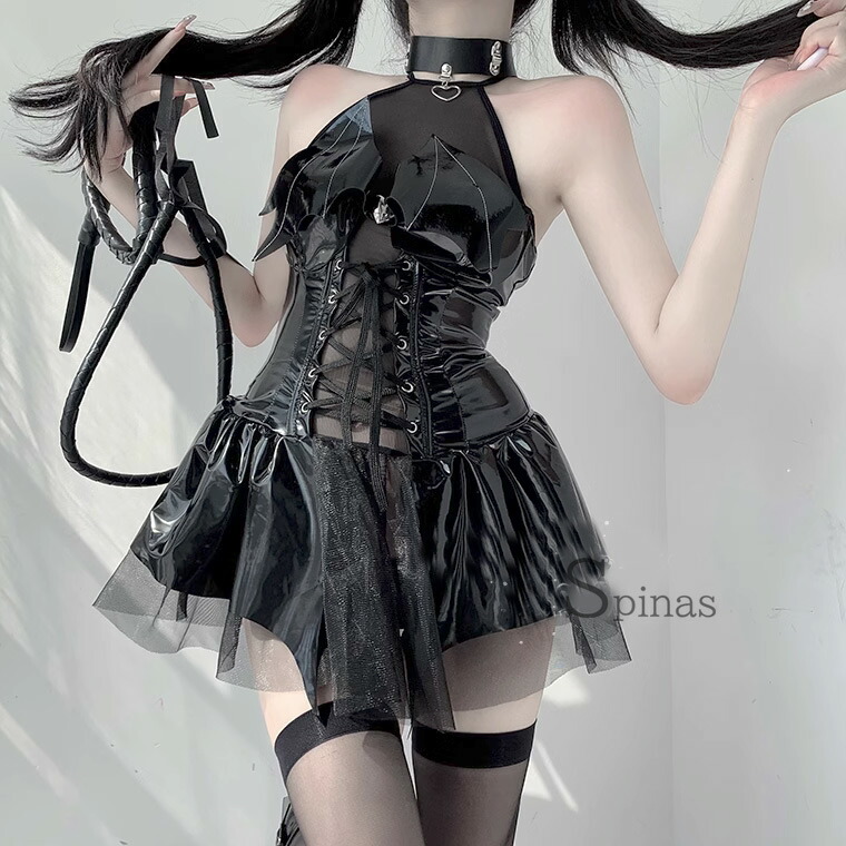 3点セット 可愛くセクシーな小悪魔 チョーカー ドレス Tバック エナメル ワンピース ボンテージ コスプレ アクマ 悪魔 羽つき 羽付 羽 レオタード