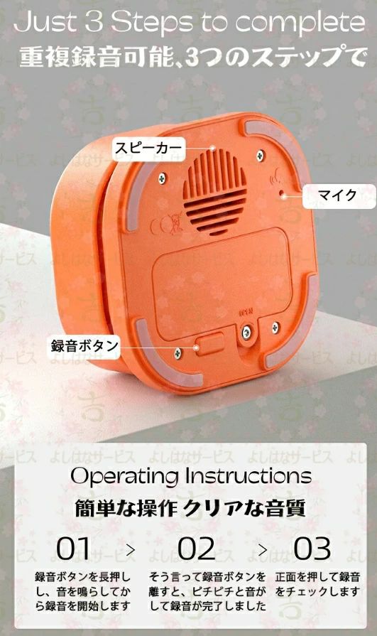 「REC」ボタンを押して、単一の「ビープ」を聞いた後、20秒以内の音声メッセージを録音し始めます。録音が終了したら、RECボタンを離して、「ビープ ビープ」というサウンドが聞こえたら録音が終了したことを示します。トップボタンを押すと、録音された音声が再生されます。