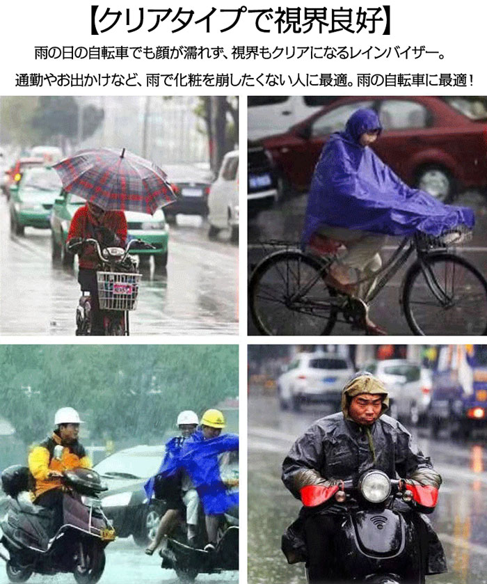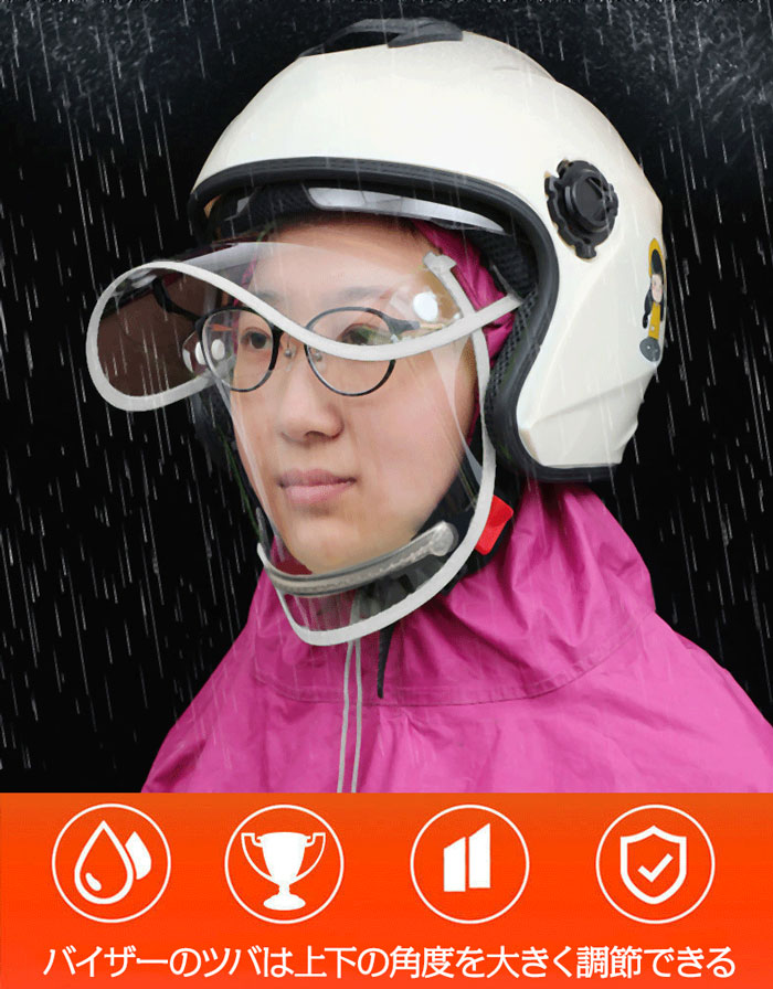 ・透明なプラスチック素材が雨水から顔を効果的に守り、