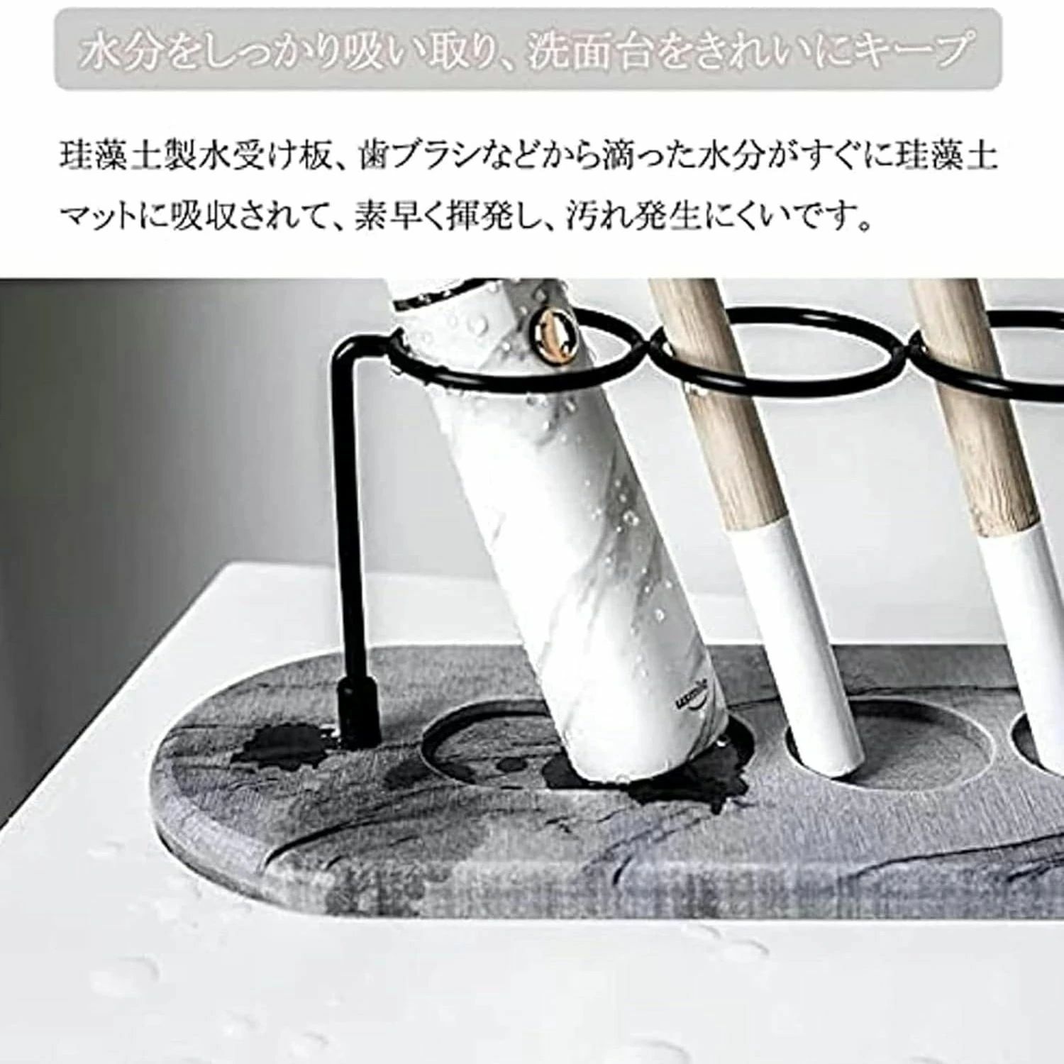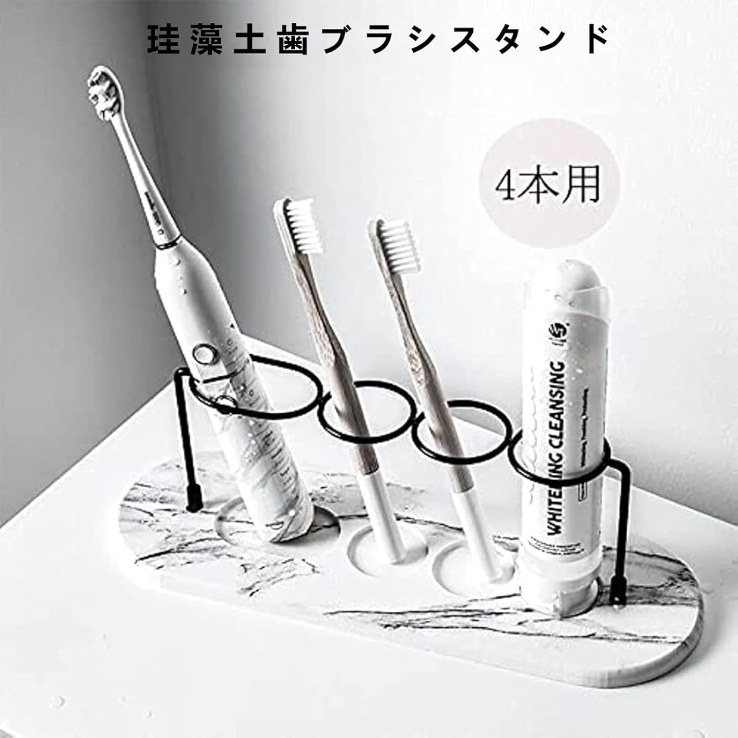 歯ブラシホルダ 珪藻土 4本用 歯ブラシスタンド 立て ホルダー 歯磨き粉 洗面所 収納 スリム 速乾 吸水 防カビ ベースフレーム 収納ラック 珪藻土トレー コップスタンドたて 多機能 衛生的 消臭