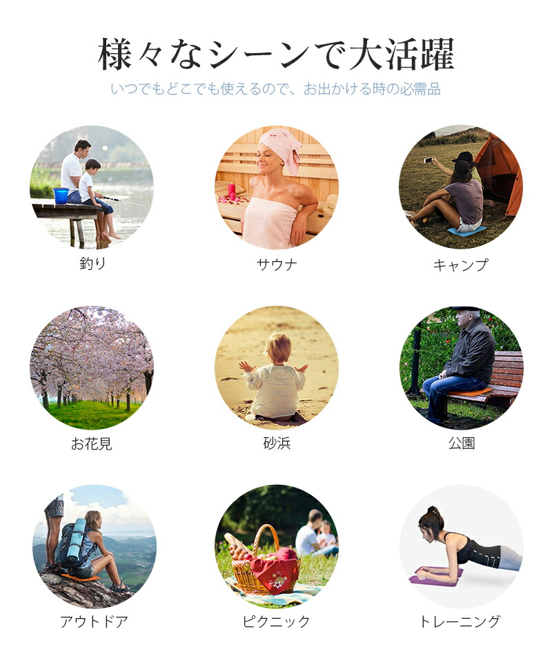 【アウトドアでも大活躍】サウナだけでなく、キャンプ、バーベキュー、スポーツ観戦、お花見、登山、海水浴、ピクニック、遠足、運動会、花火大会など、季節問わず様々なシーンでお役立て頂けます。