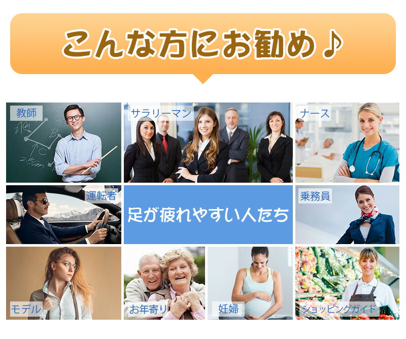「こんな方におすすめ」立ち仕事の方、オフィスワークの方、乗務員、スチュワーデス、ナース、看護師、工事作業員、または、ランニング、ウォーキング、スポーツなどで脚のむくみが気になる時などにオススメします。