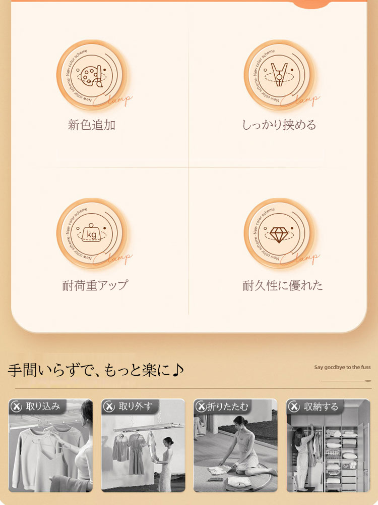 衣服を干す際にそのまま収納できる一体型設計で、場所を取らず、整理整頓も簡単。