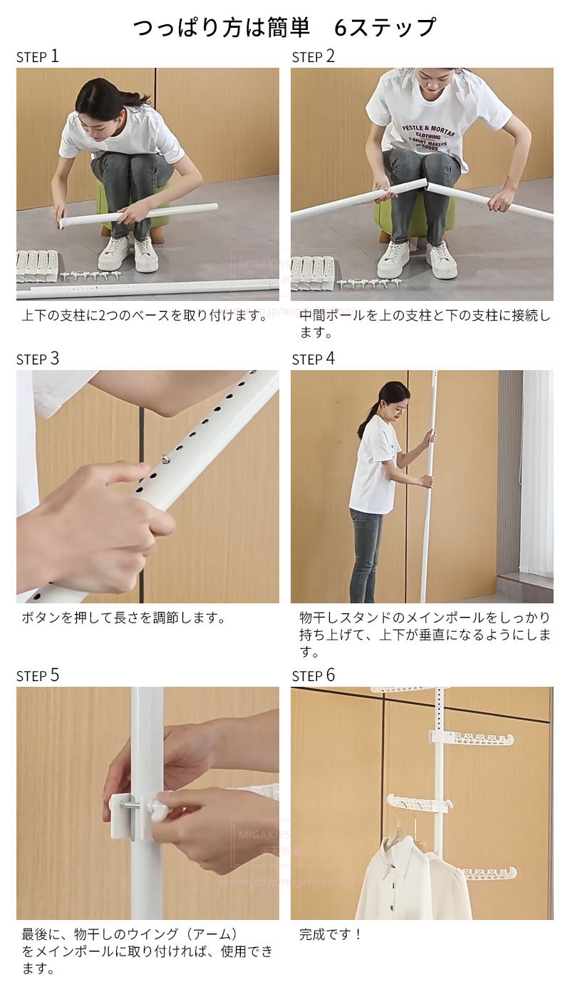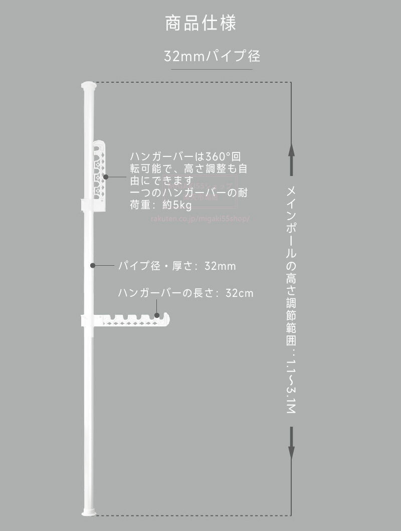 つっぱり式ハンガーラック 3段 4段 ホワイト ブラック ハンガーバー3段 ハンガーバー4段 ハンガーバー5段 ハンガーバー6段