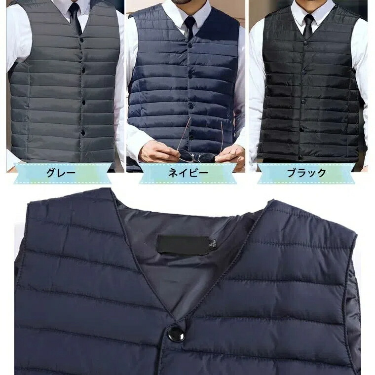 軽量 着ぶくれない お洒落なメンズ中綿ベスト インナーベスト かさばらない 着ぶくれしない 着膨れない 薄手 フェイクダウン ショート丈 男性 ファスナー ボタン 大きいサイズ ノーカラー