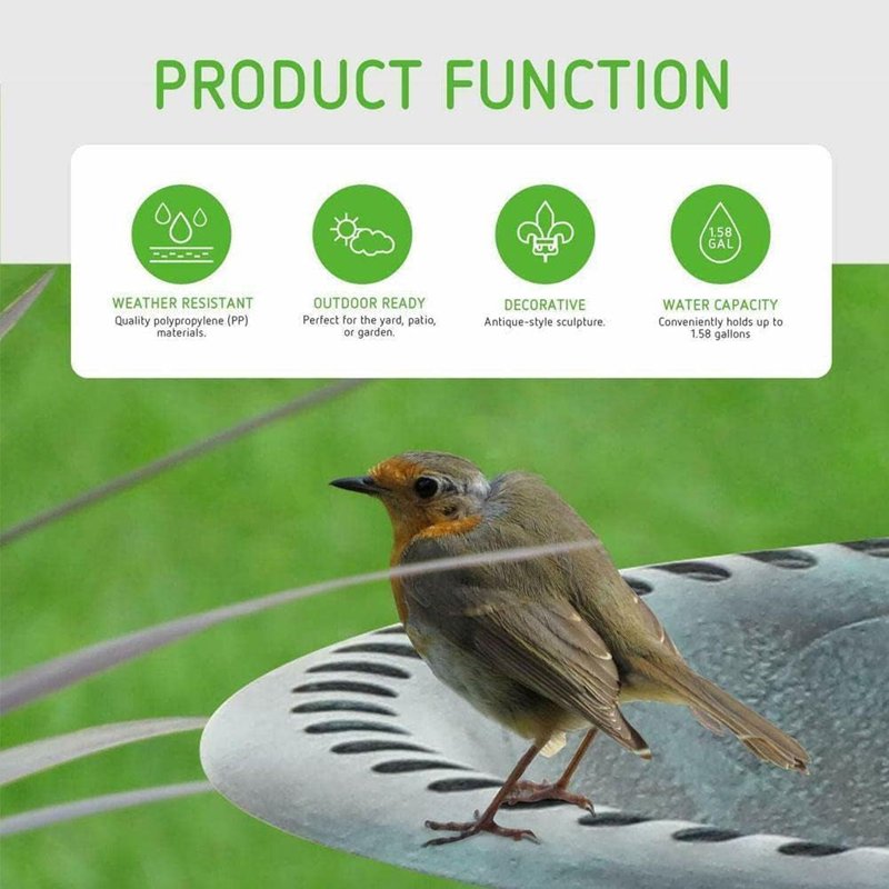 耐久性のある素材:バードバスは耐候性のあるポリ樹脂でできており、美しいデザインと仕上げが施され、長年の使用に耐える丈夫で耐久性があります。