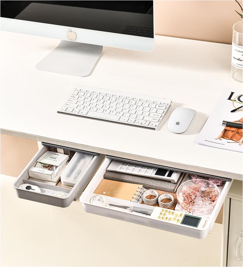 ▲テーブルや棚下の隙間やデッドスペースが活用できる取付式引出しです。デスクや机下に隠せるタイプとなっておりますので、デスク収納空間を広げます。