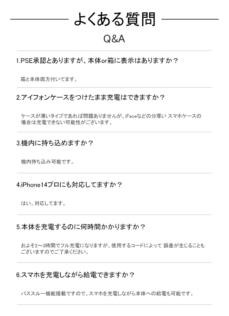 A:パススルー機能搭載ですので、スマホを充電しながら本体への給電も可能です。