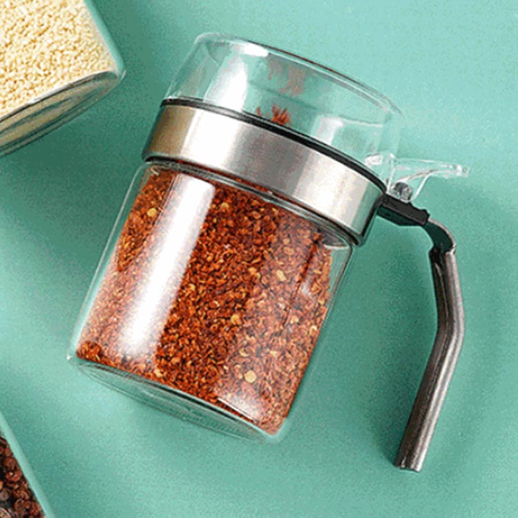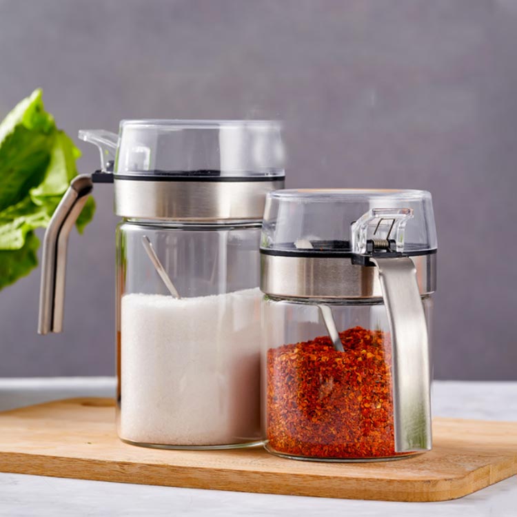 300ml 2個セット 調味料ポット 耐熱 調味料ケース ガラス スパイスジャー ステンレス 片手開閉 砂糖 塩 スプーン付き スパイス 密閉 保存 500ml スプーン 使いやすい 容器