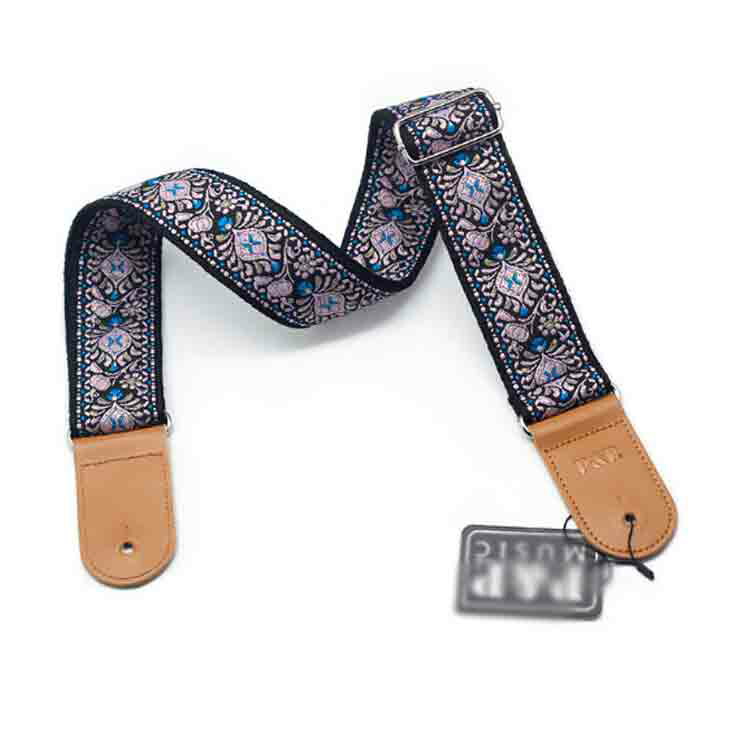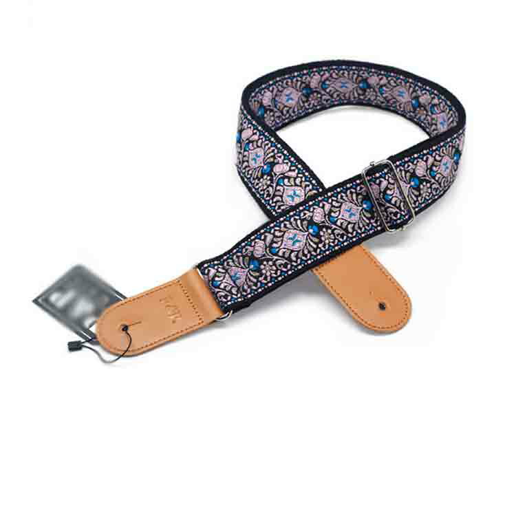 鮮やかな発色とヴィンテージパターンの柄が特徴的なギターストラップです。