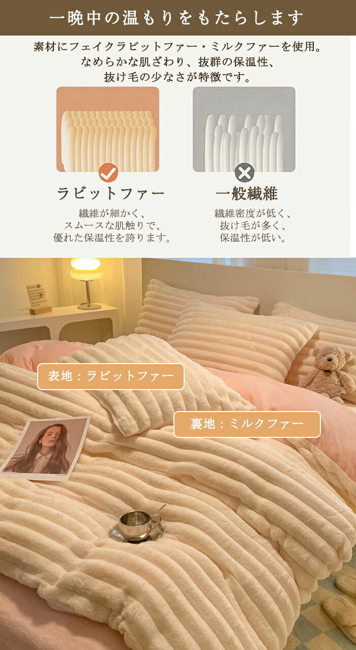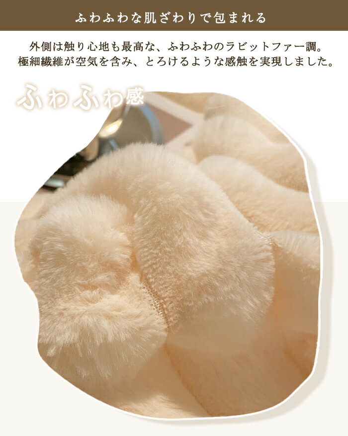 冬の必需品!ラビットファー・ミルクファー素材がしっかり防寒。裏起毛で寝床の中をポカポカに保ち、暖房いらずのぬくもりを。