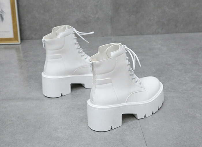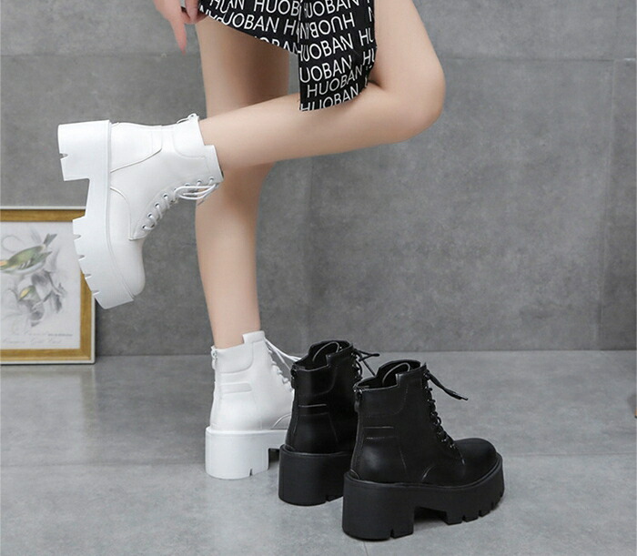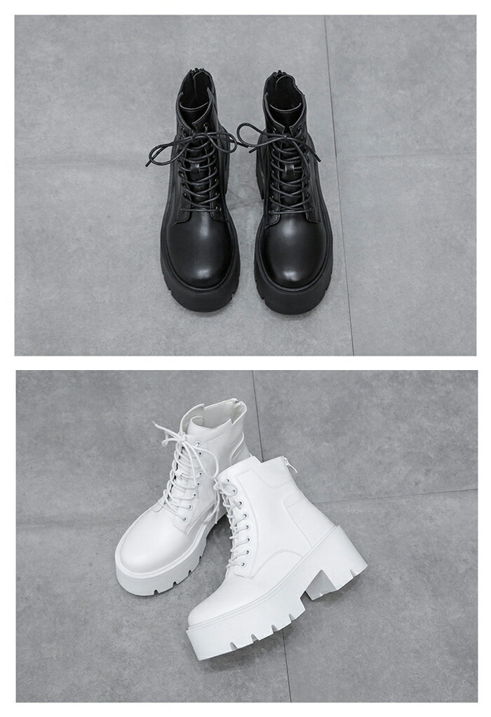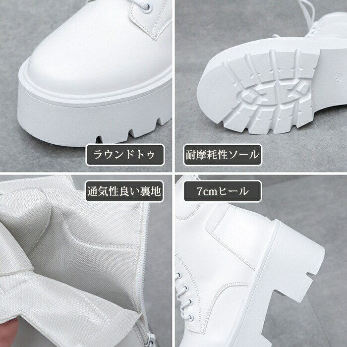 商品名:ショートブーツ レースアップブーツ レディース ラウンドトゥ 厚底 7cmヒール ハイヒール 編み上げ 靴 スタイルアップ ショートブーツ 美脚 黒 白 靴 痛くない 履きやすい 英国風ブーツ PU 無地 太ヒール 軽量 シンプル 通勤 通学 デート 春 秋