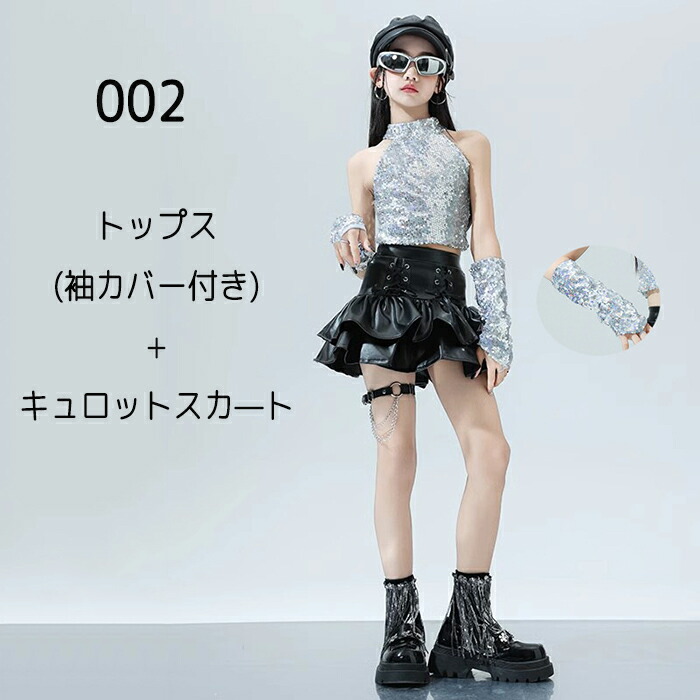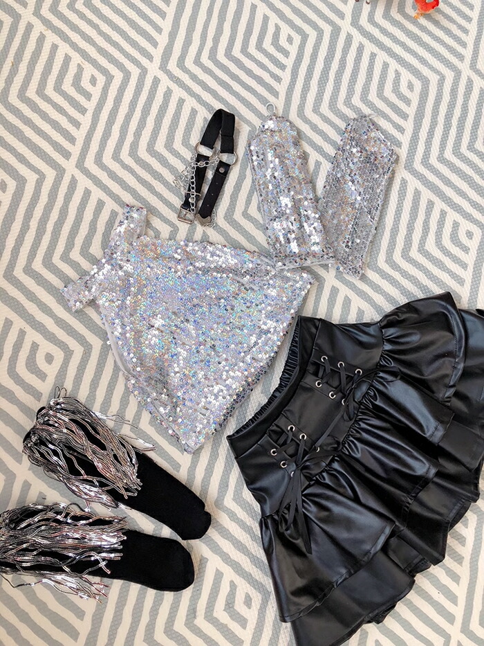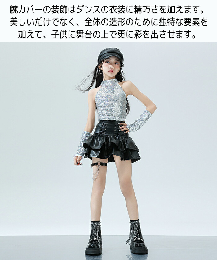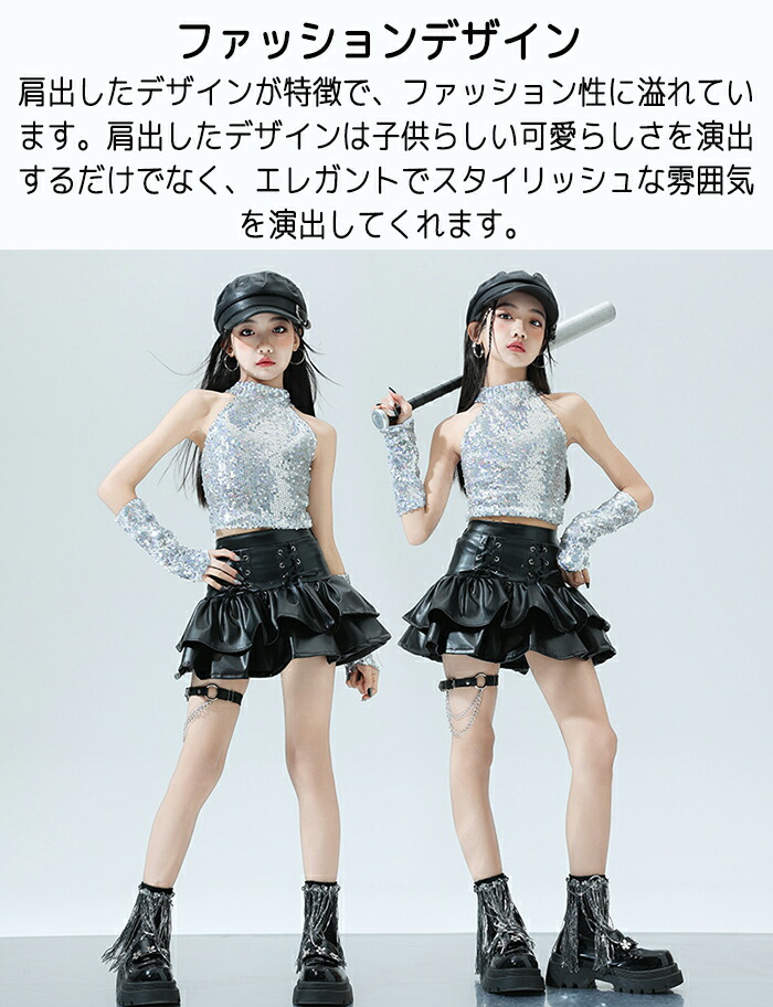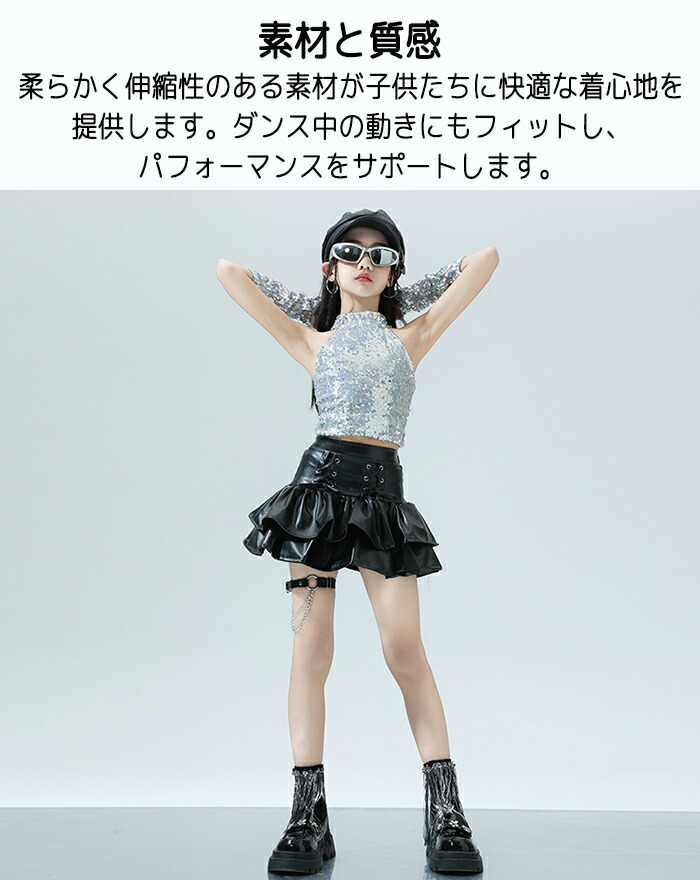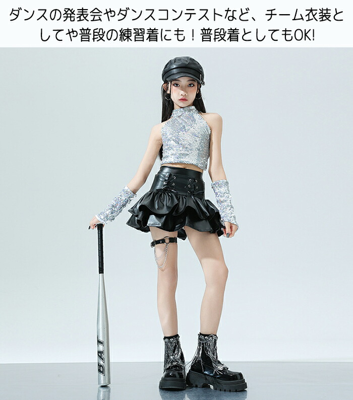 キッズ ダンス衣装 ヒップホップ キラキラ k-pop 衣装 銀色 黒色 PU レザースカート タンクトップ 女の子 jazz HIPHOP 上下セット スカート ダンスウェア チアリーダー へそ出し