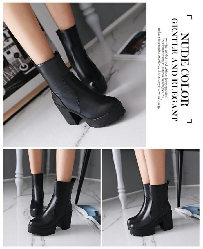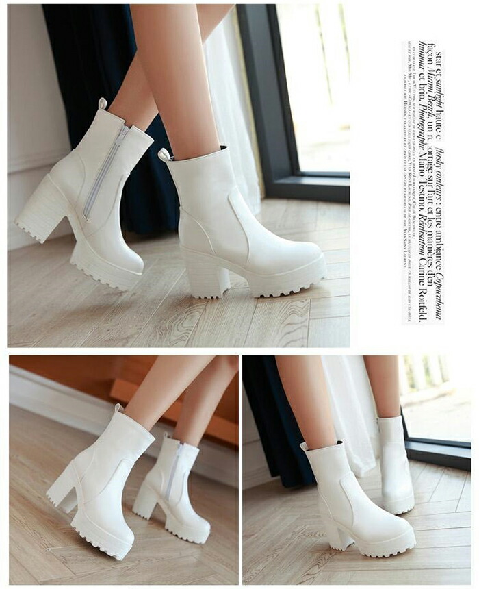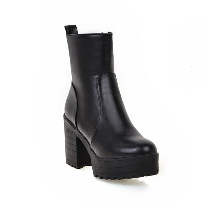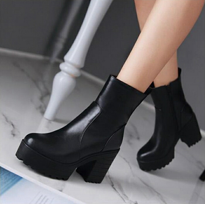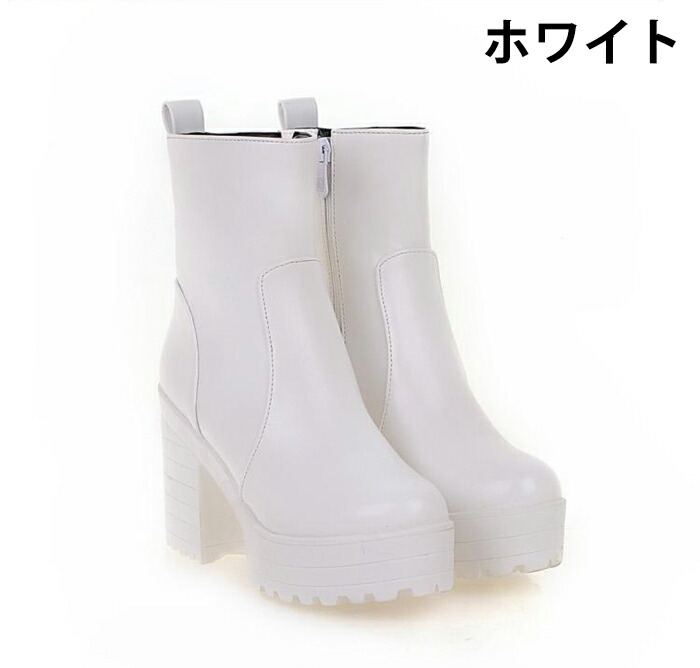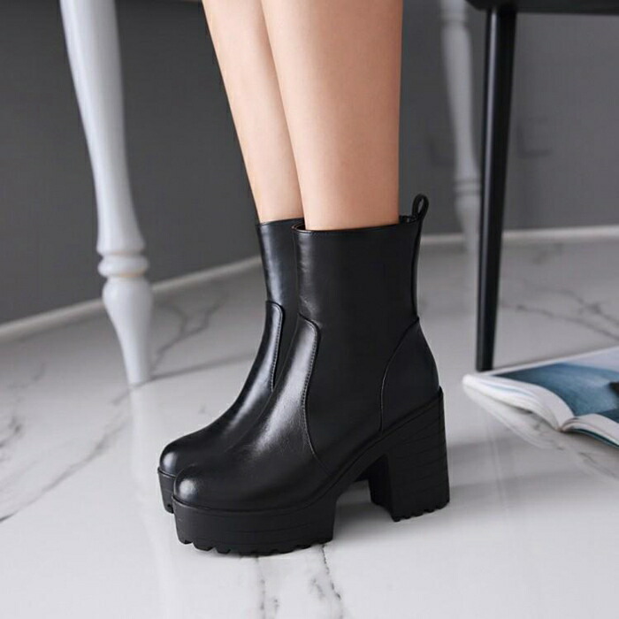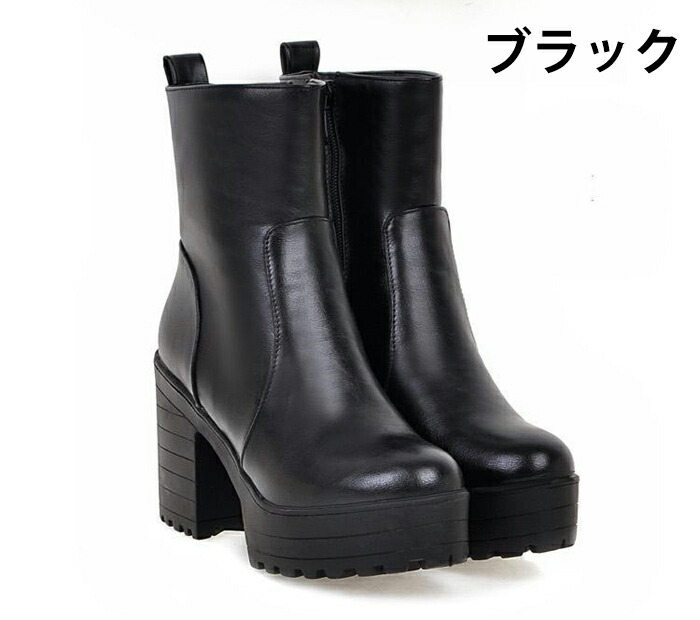 商品名:ショート ブーツ ラウンドトゥ レディース 厚底 9.5cmヒール サイドファスナー スタイルアップ ハイヒール チャンキーヒール 美脚 細見せ 靴 痛くない 履きやすい 英国風ブーツ 黒 白 女生 無地 ゆったり 太ヒール シンプル 通勤 通学 デート 春 秋